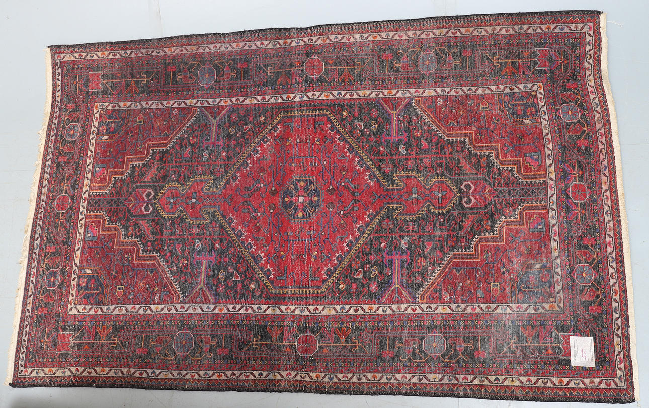 Den stora centrala sexkantiga medaljongen och spandrels på en röd botten mot ett svart fält, 235cm x 152cm