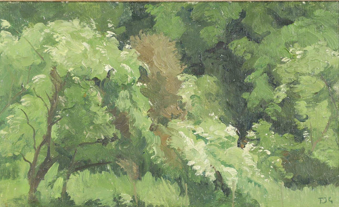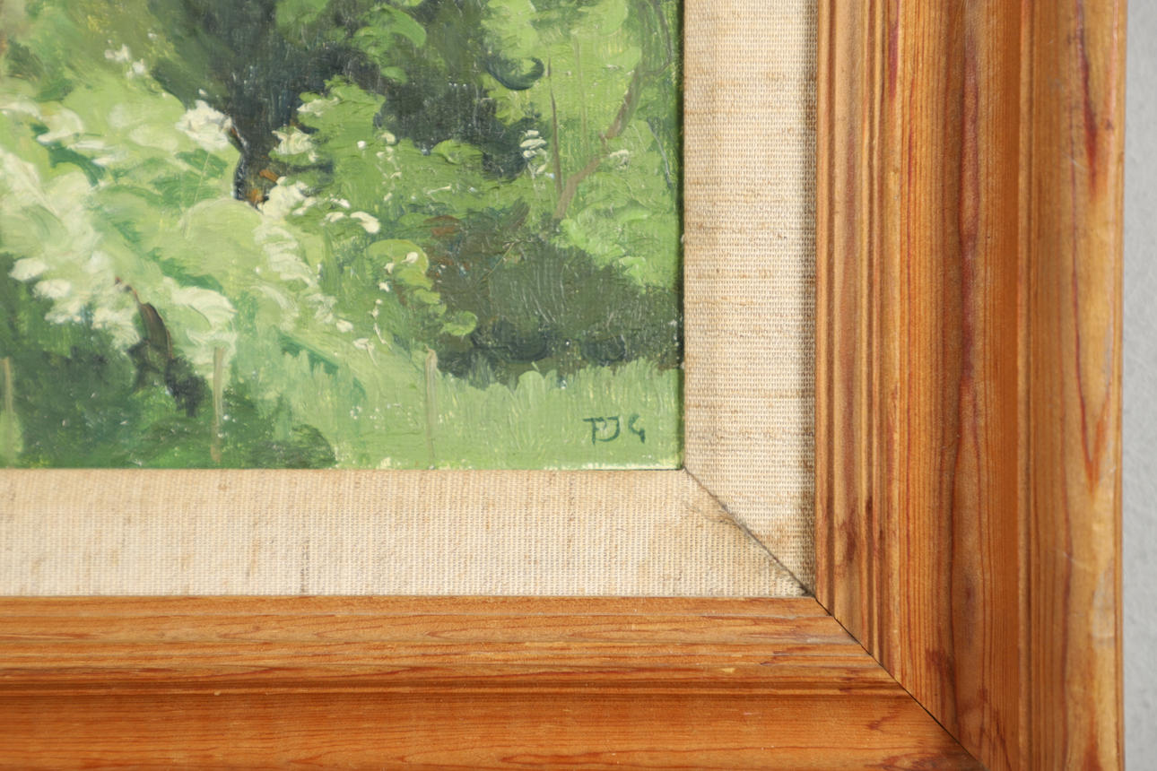 OLJA PÅ PANNÅ, skogslandskap, signerad PTG (Peter John Garrard). Synåtgärder: 25cm x 15 cm. Total storlek: 39cm x 29cm.
