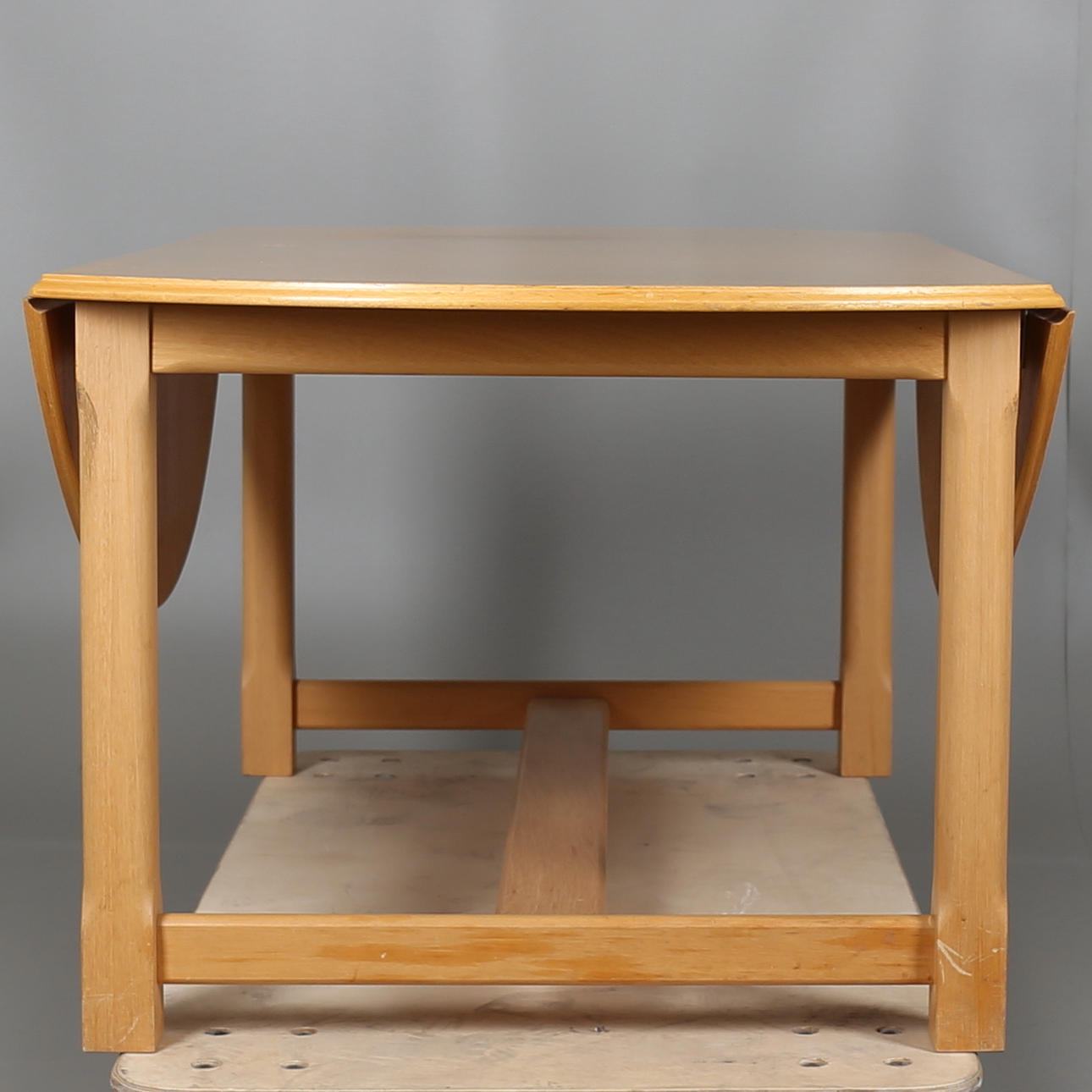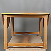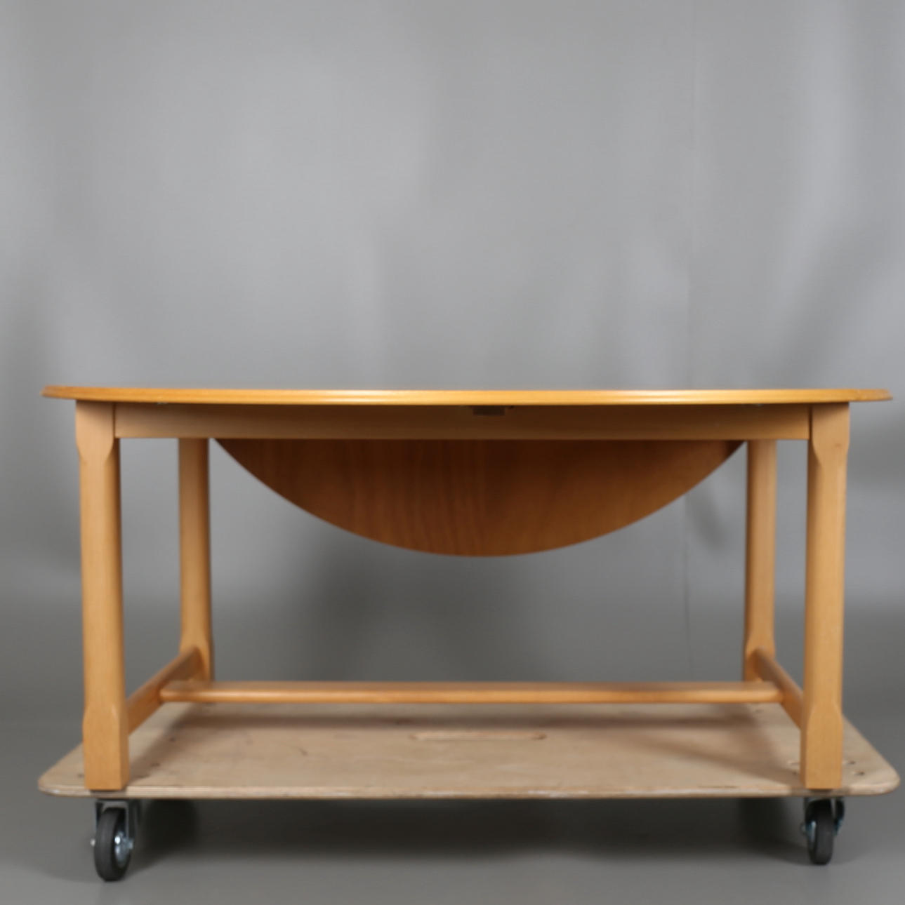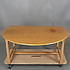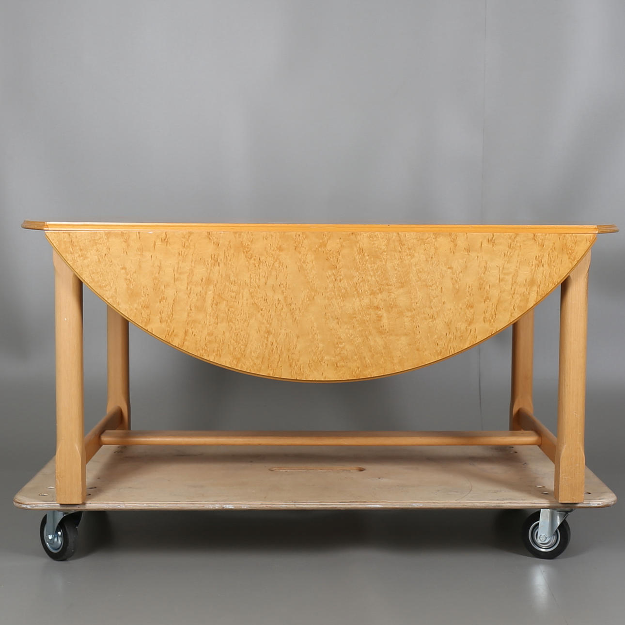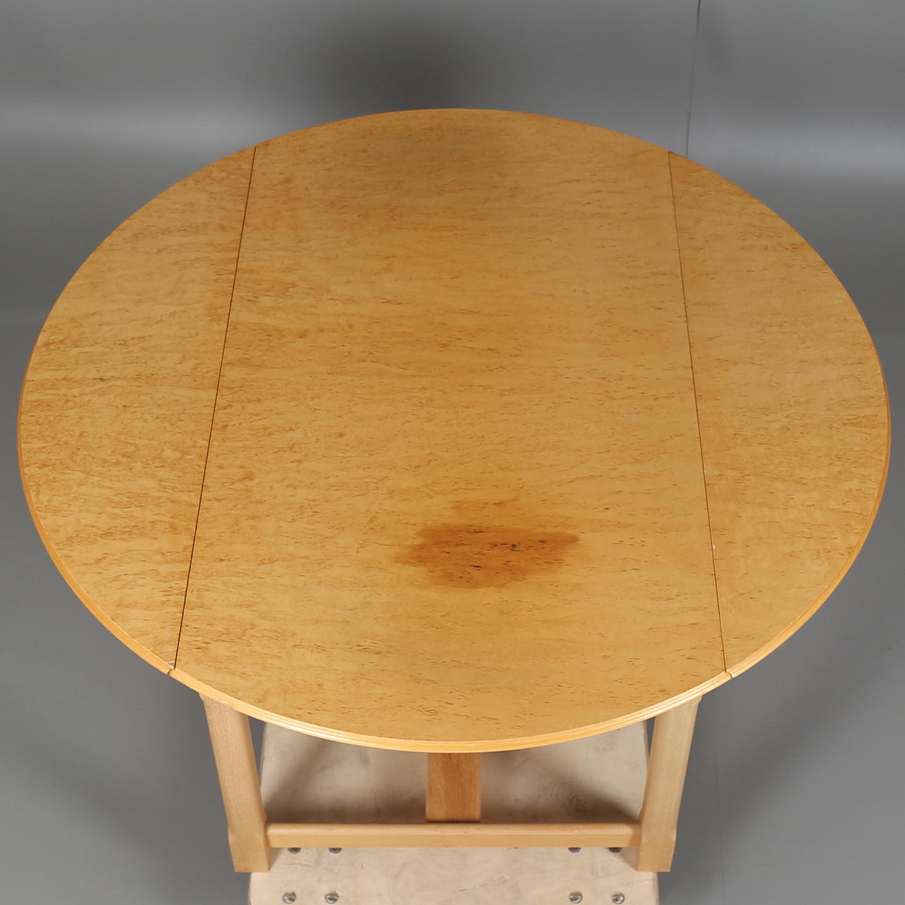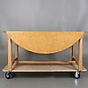 Soffbord i masurbjörk med två uppfällbara klaffar, längd 125 cm, djup 70 cm, höjd 54 cm, med uppfällda klaffar, diameter 125 cm, höjd 54 cm.