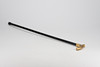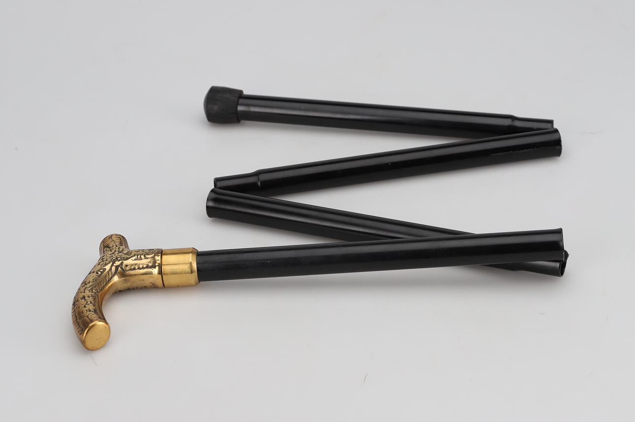 Krycka i mässing, käpp i svartlackerad metall, ihopvikbar. Längd 93 cm, ihopvikt 29 cm.