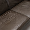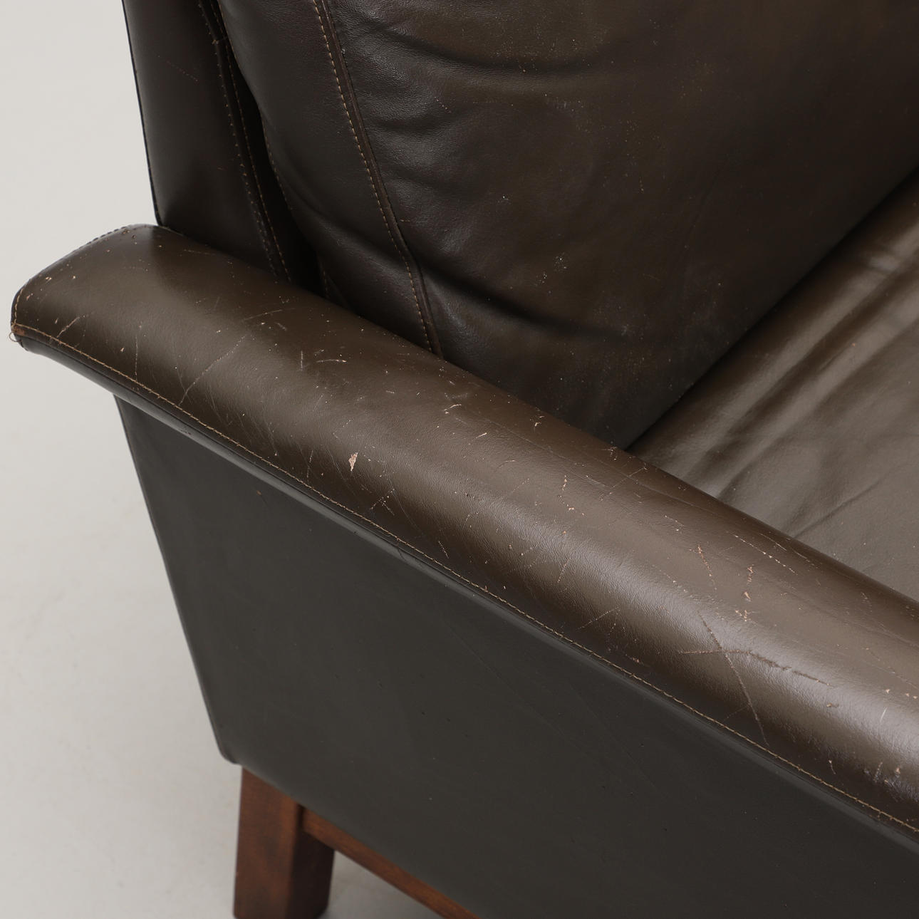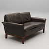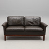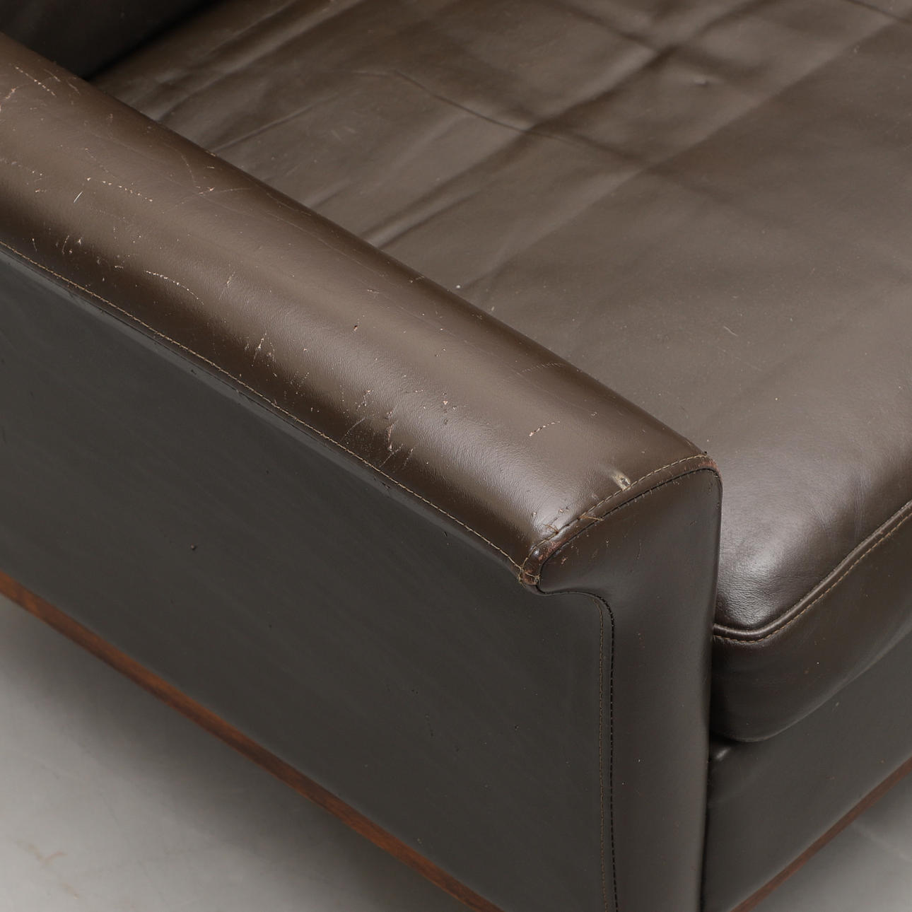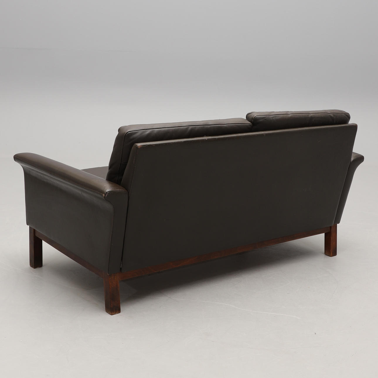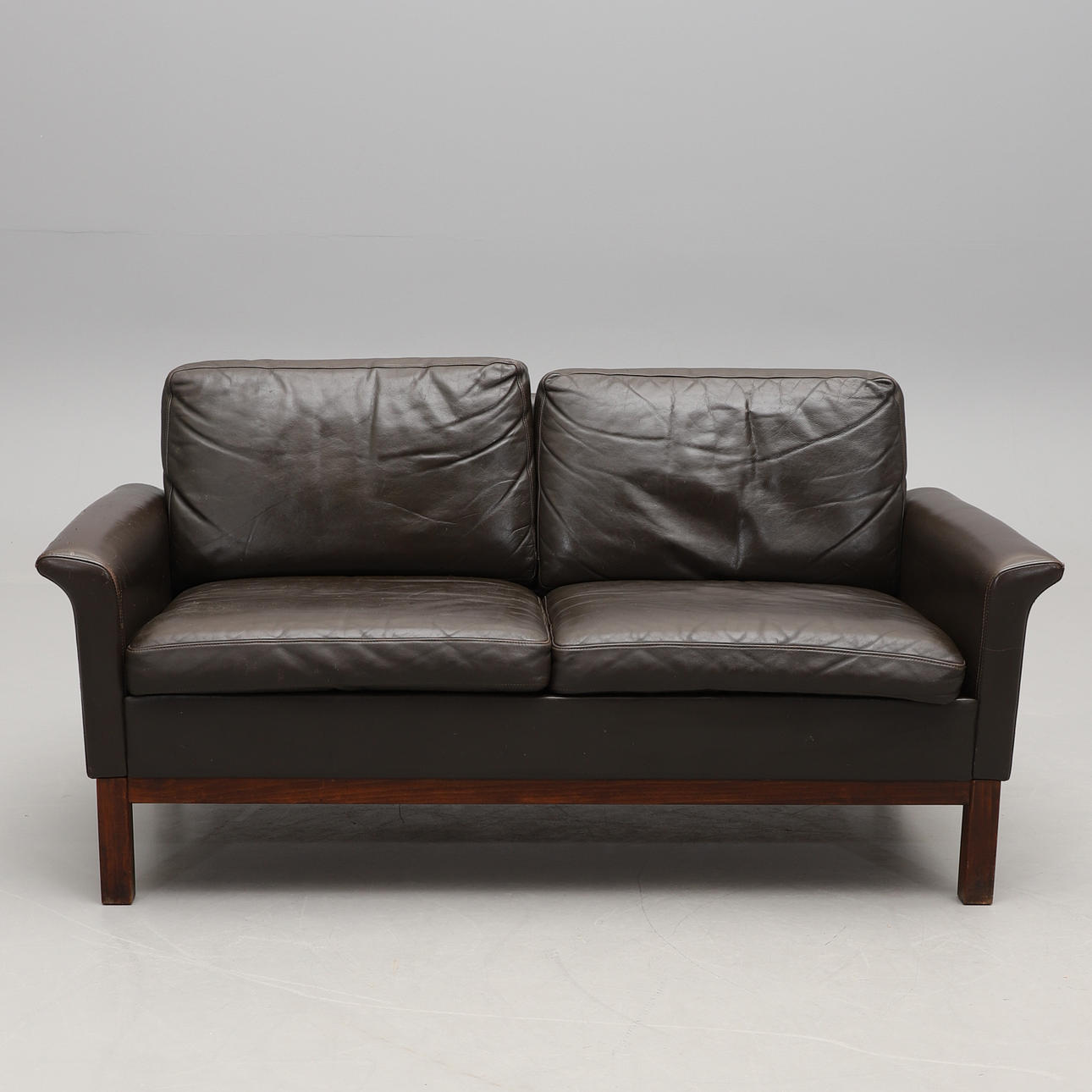 Tvåsitsig, klädd i mörkbrunt skinn. Lösa stoppade dynor. Längd 148, djup c:a 78, sitthöjd c:a 40 cm.
