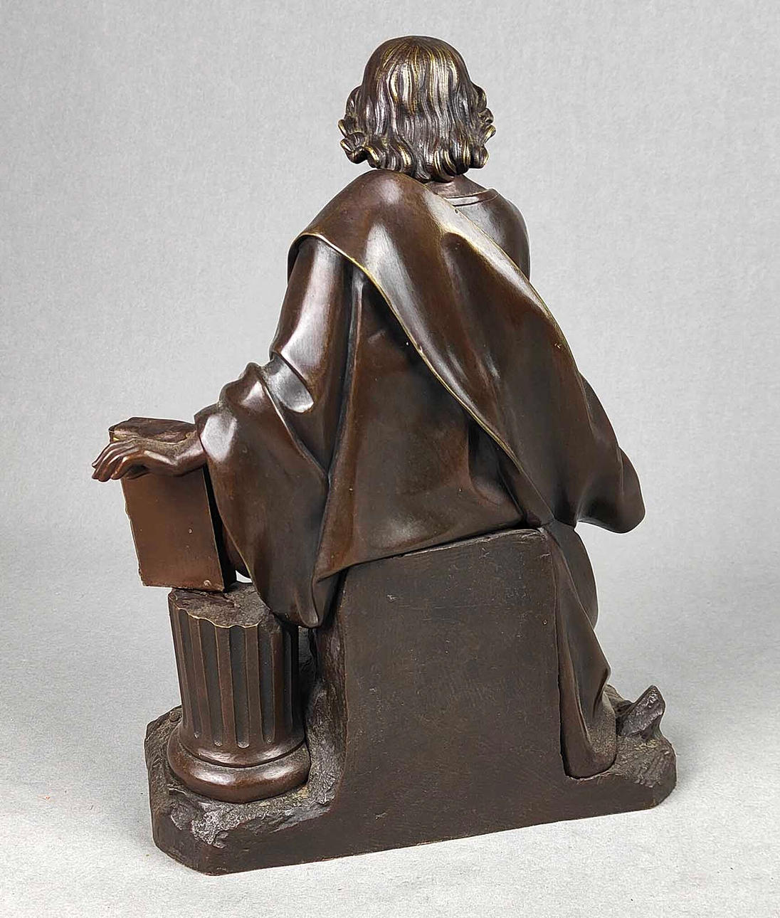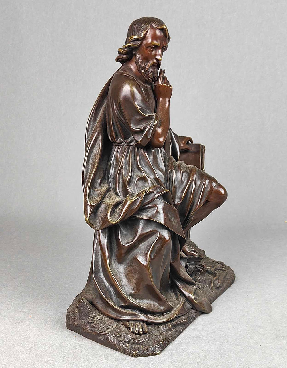osignerad, skildring av den sittande Matthew, en av de tolv apostlarna, den högra handen med en penna fundersam på hakan, å andra sidan stöds på en klämbar bok (löst innesluten) på en kolumn, H ca. 33 cm, naturalistisk bas ca. 24 x 14 cm.