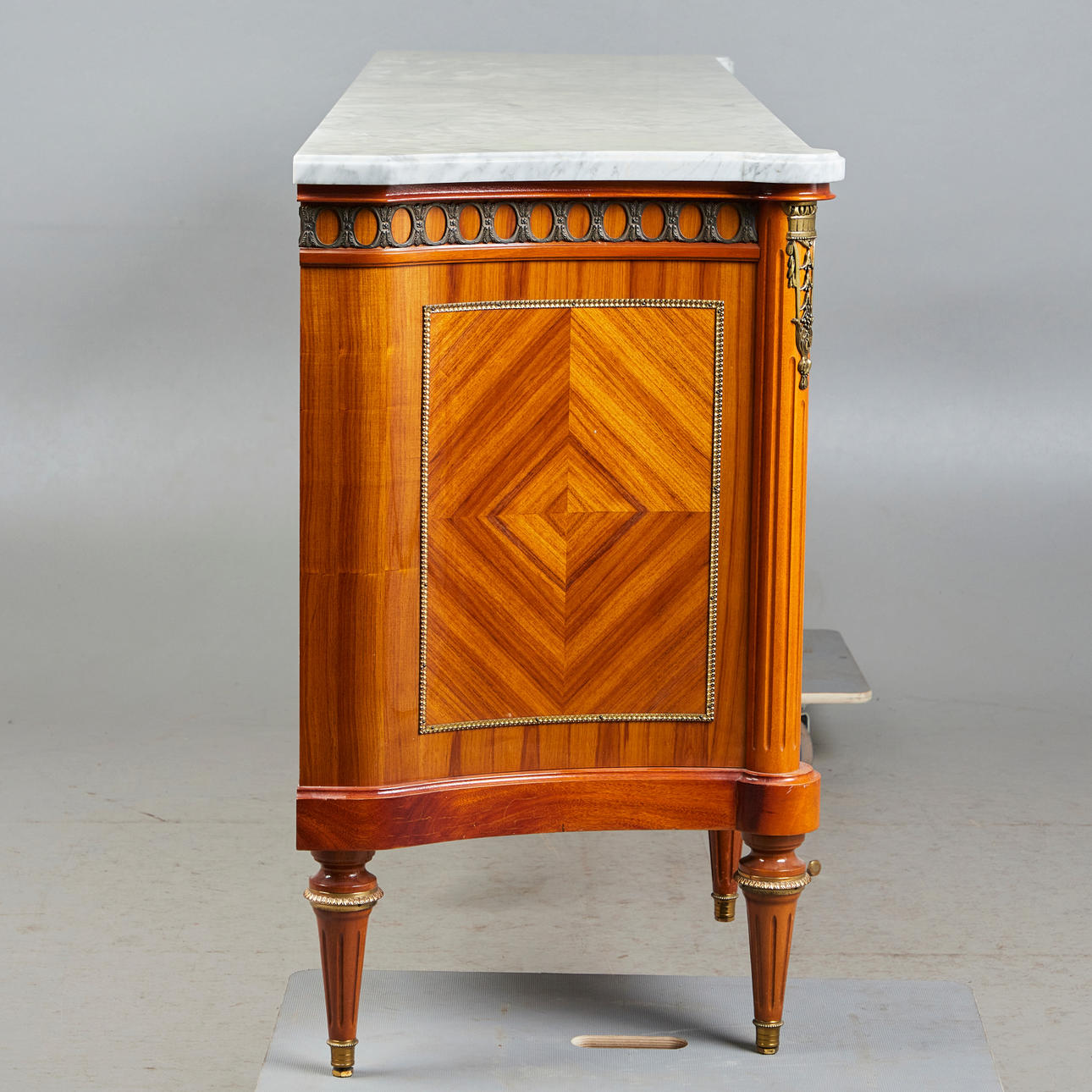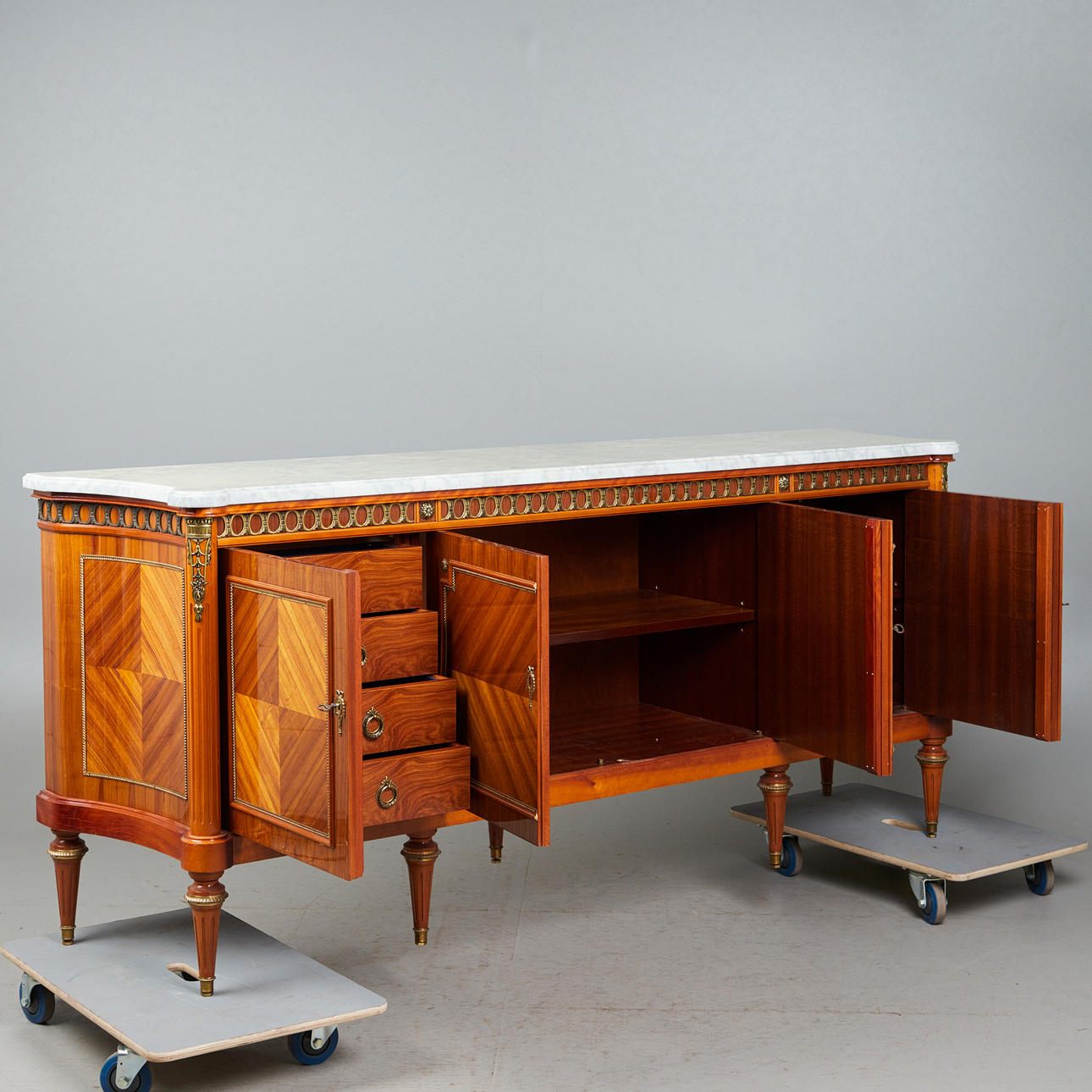 Skänk/byrå, körsbär, marmor, metall. Skänk med rektangulär körsbärsträskropp och metallbeslag, med en vit marmorskiva med grå ådring på toppen, med fyra låsbara dörrar, en hylla på insidan och fyra lådor på vänster sida, tre lådor på vänster sida, tre lådor med blå filt, marmorskiva och kaross färdig med lacktätning, tre nycklar tillgängliga, H.100cm, L.230 cm, W.55cm.