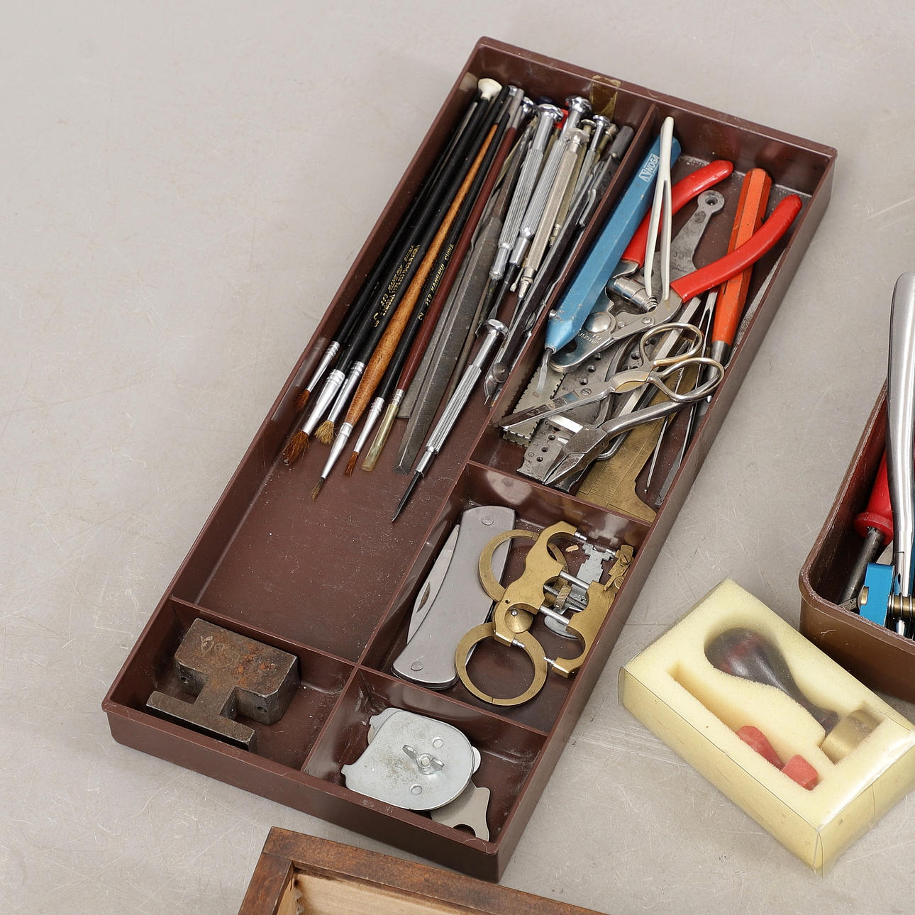 Diverse verktyg och mätinstrument, bla för urmakeri.