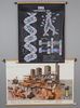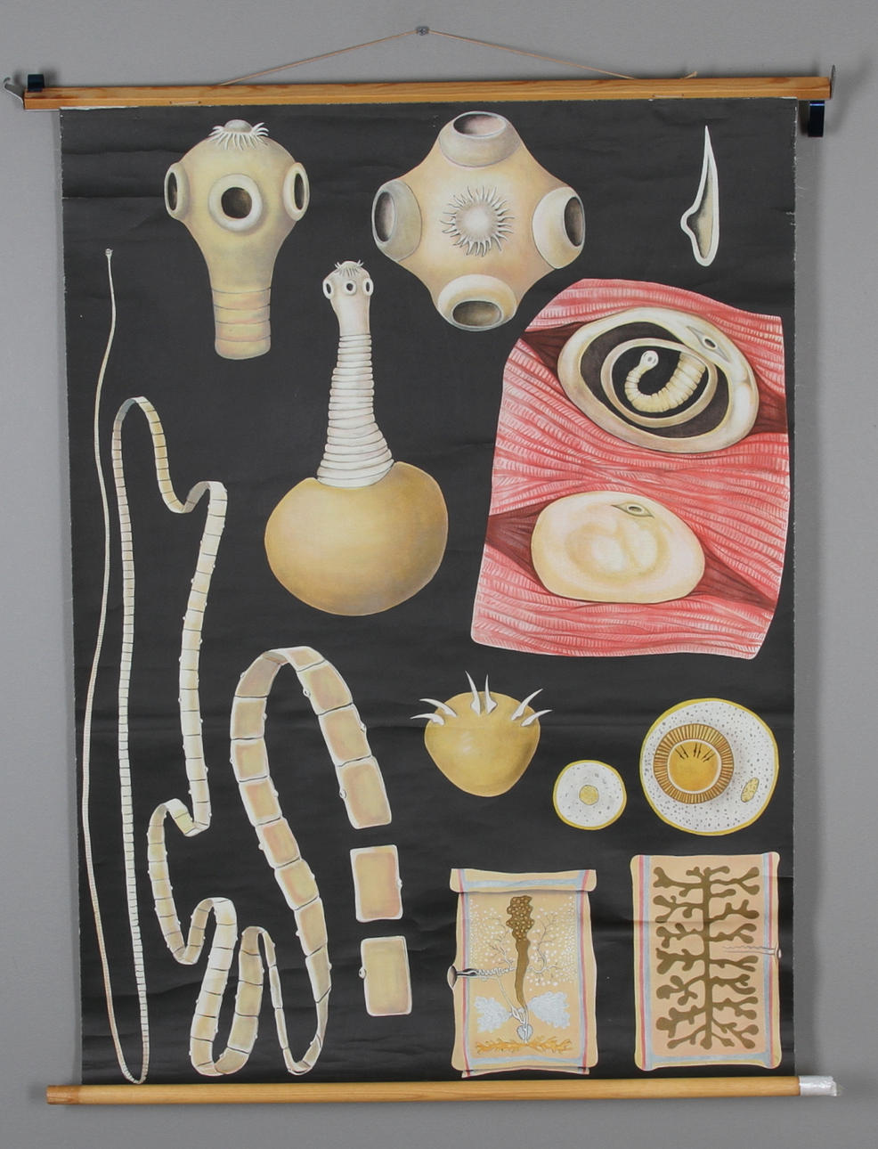 Planscher på rulle föreställande, binnikemask, DNA och stålframställning. Den störstas mått, längd 88, höjd 115 cm.