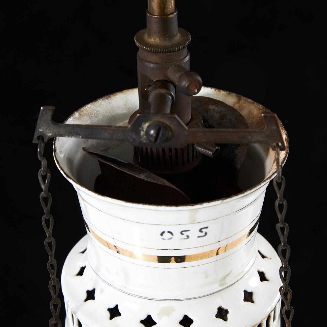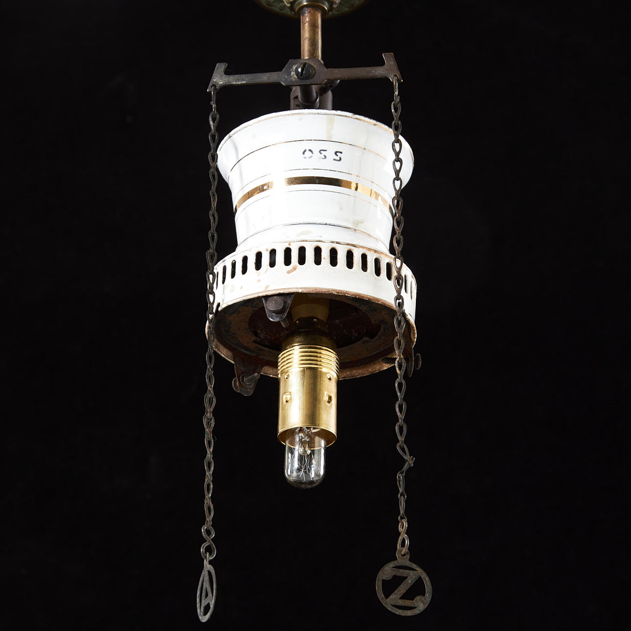 GASLAMPA, SENT 1800-TAL, metall och hölje av vitemaljerad metall, omarbetad för elektrifiering, märkt O S S, mått ca 26 x 11 cm.