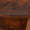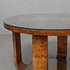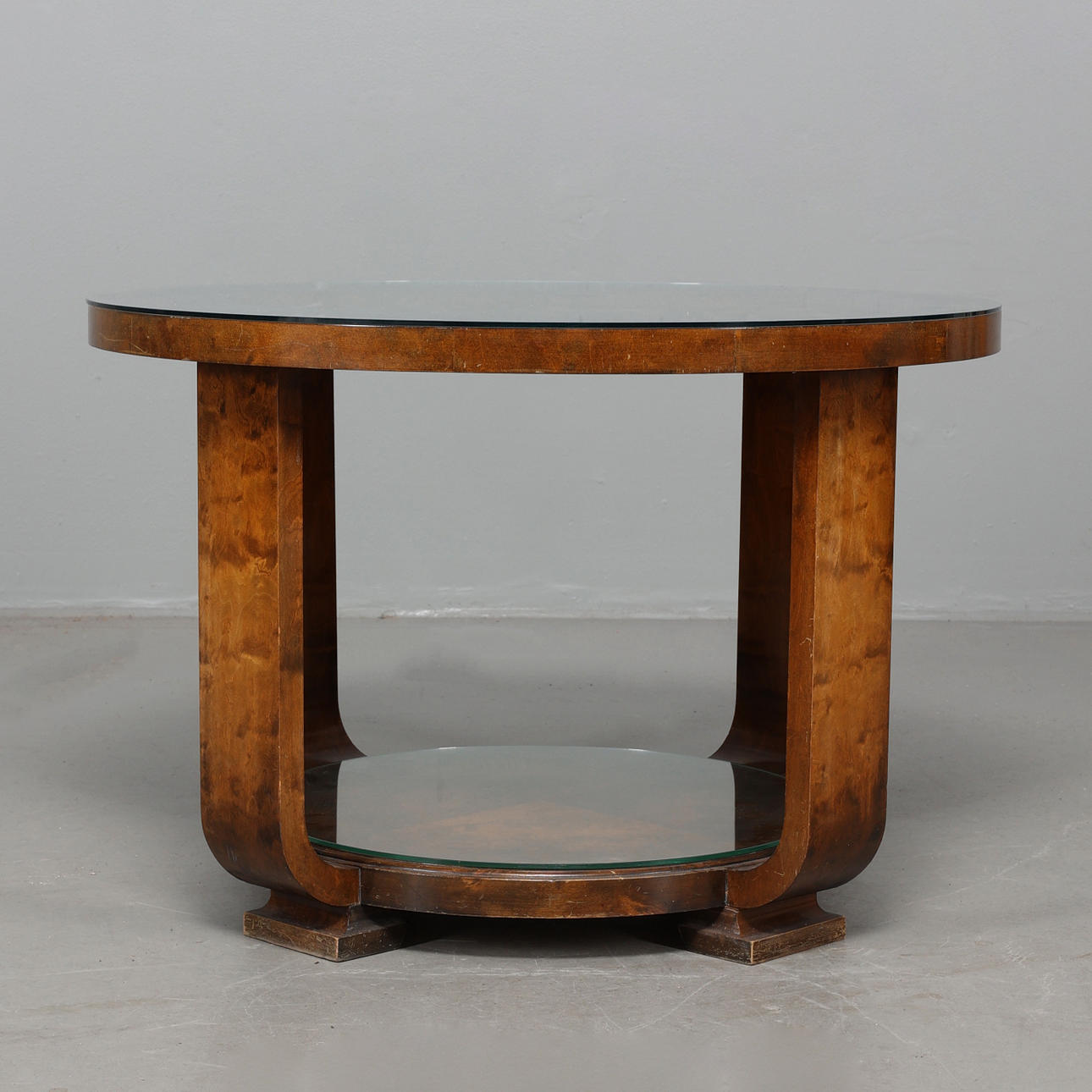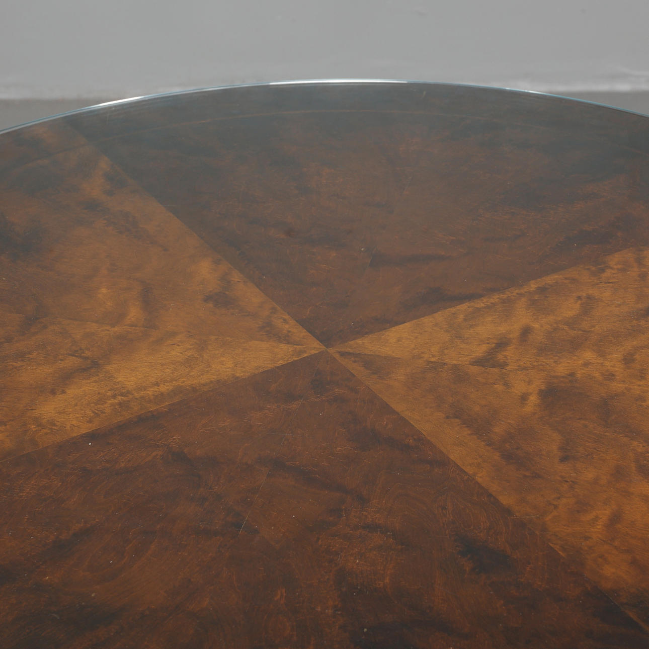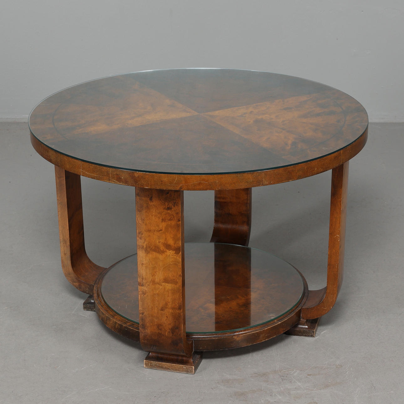 Runt bord i mörkbonad björk, med fyrbent kopplad benställning. Skyddsskiva i glas för toppskiva och underhylla. Mått: Ø 95 cm, höjd 63 cm.