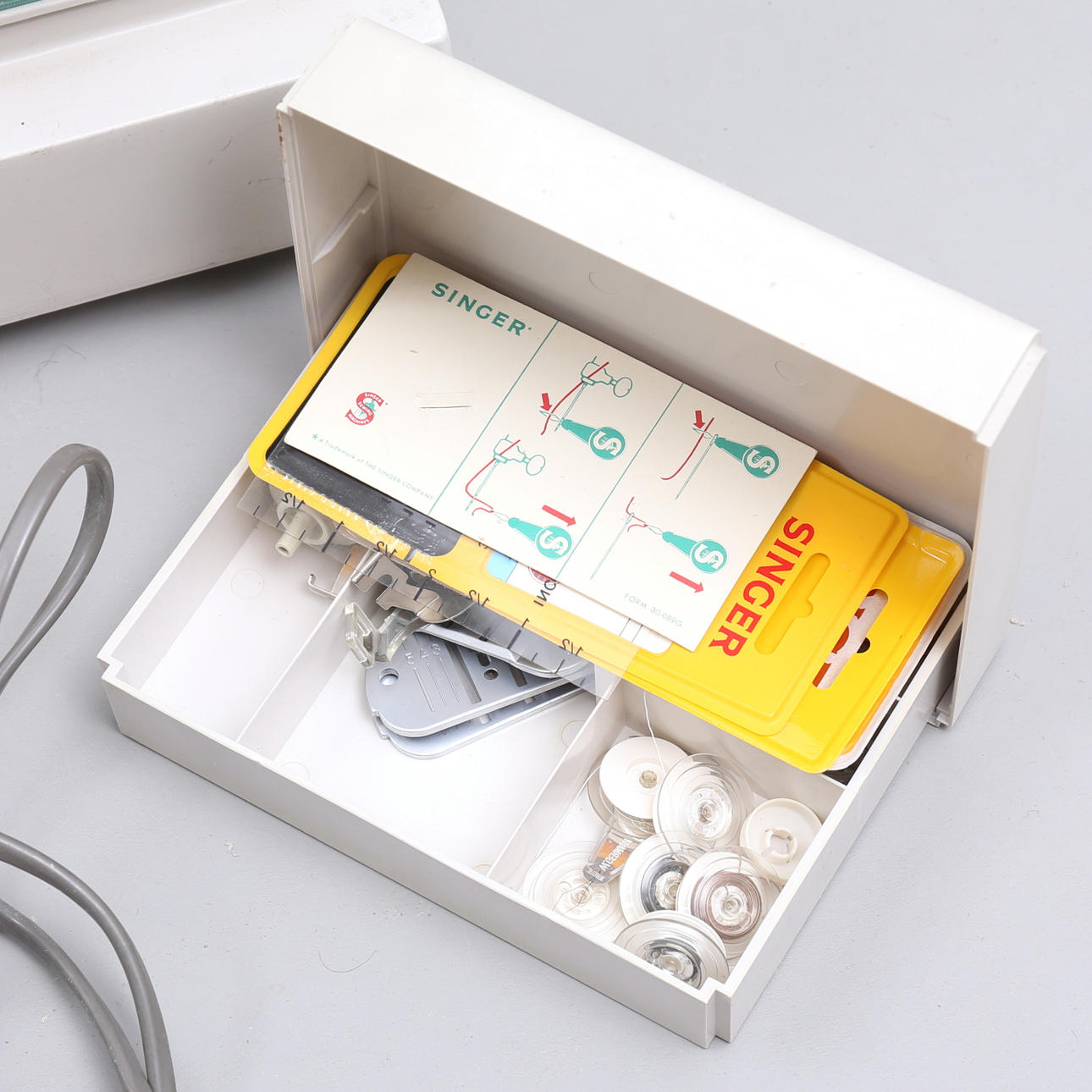 Pressarfötter samt rullar till undertråd medföljer.