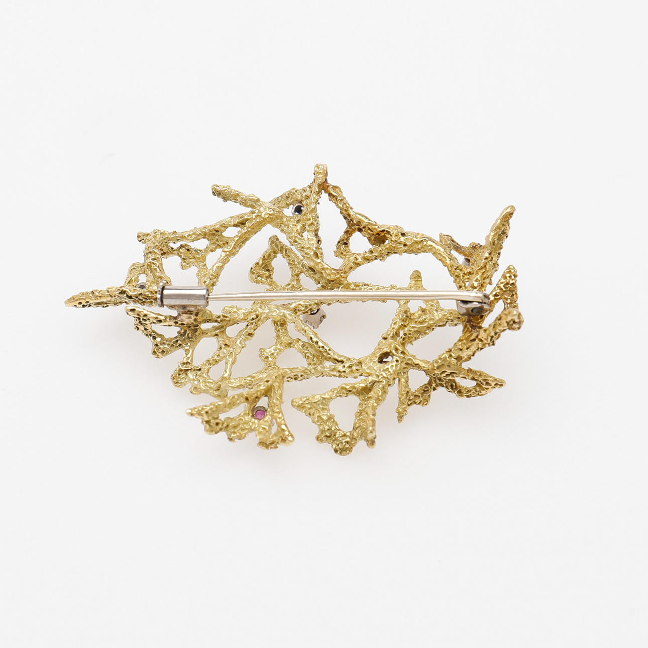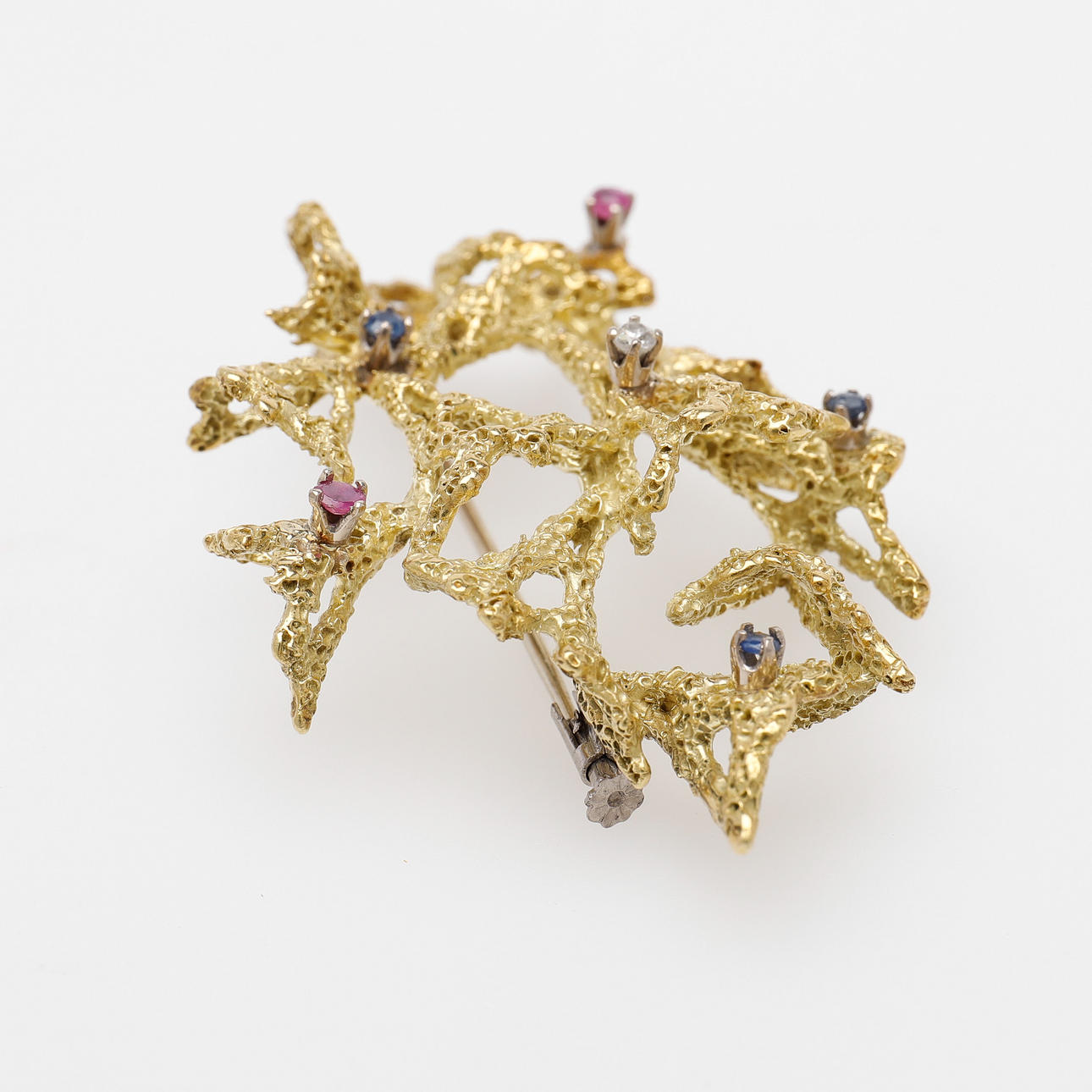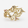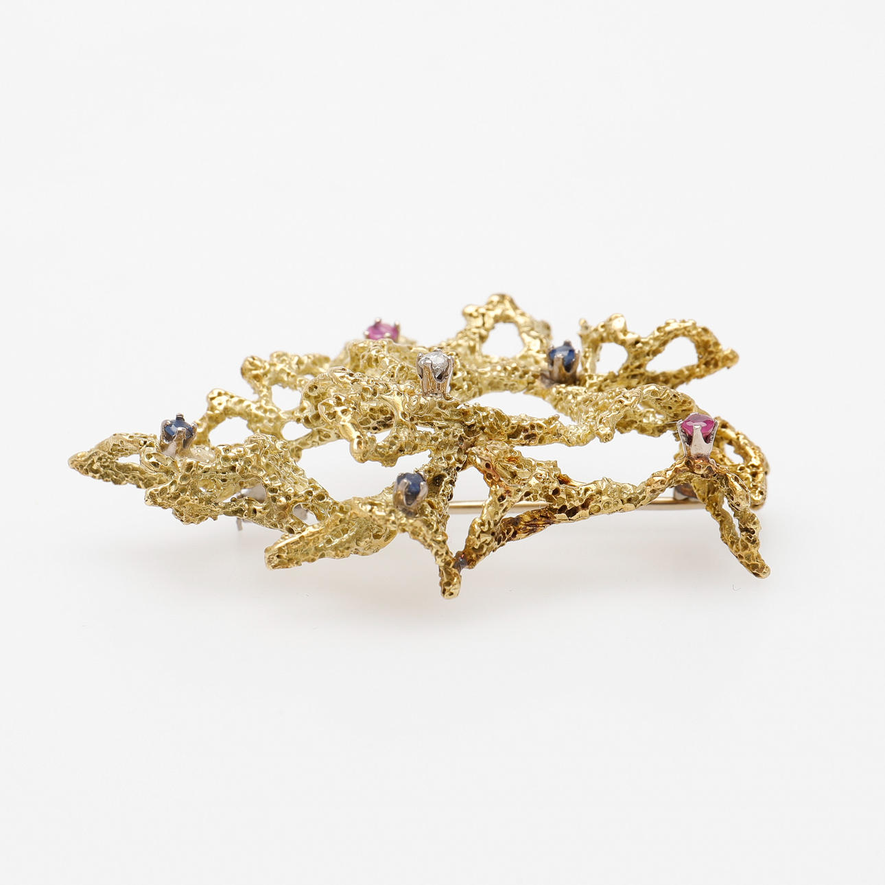 18k guld med en diamant, två rubiner och tre blå safirer, ej stämplad, längd 57 mm, vikt 19,1 gram.