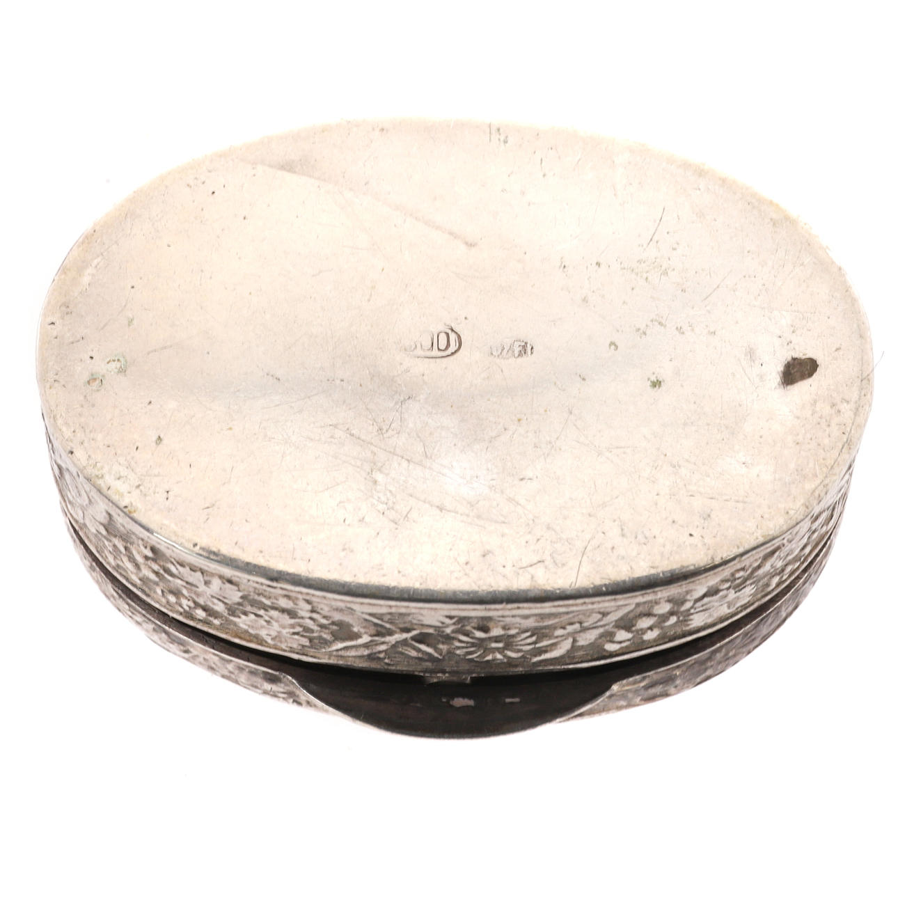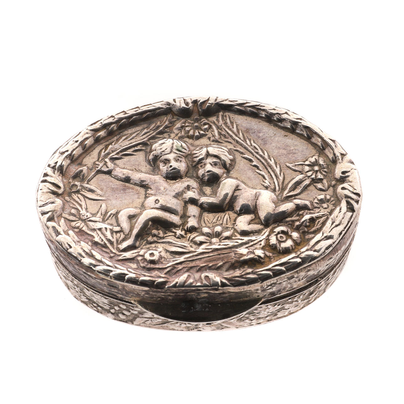 March Brothers, Birmingham 1905, gångjärnslocket och basen med en scrollwork kant, förgylld fodrad, 5,5 cm x 5,5 cm x 2 cm, också att inkludera en kontinental 800 mark oval silverlåda, i 18th century stil, gångjärnslocket präglat med putti, omgiven av blommor och blad, 4cm bred, 65g, 2.09oz (2).