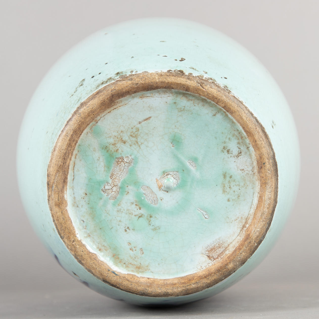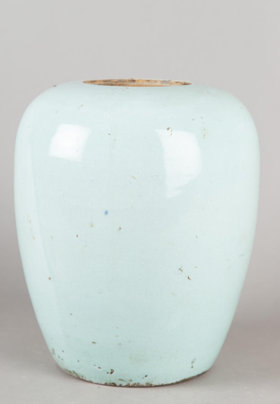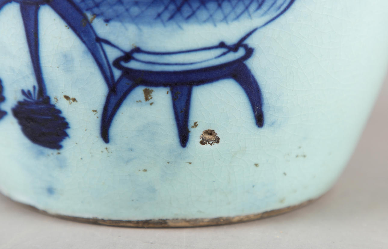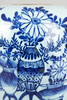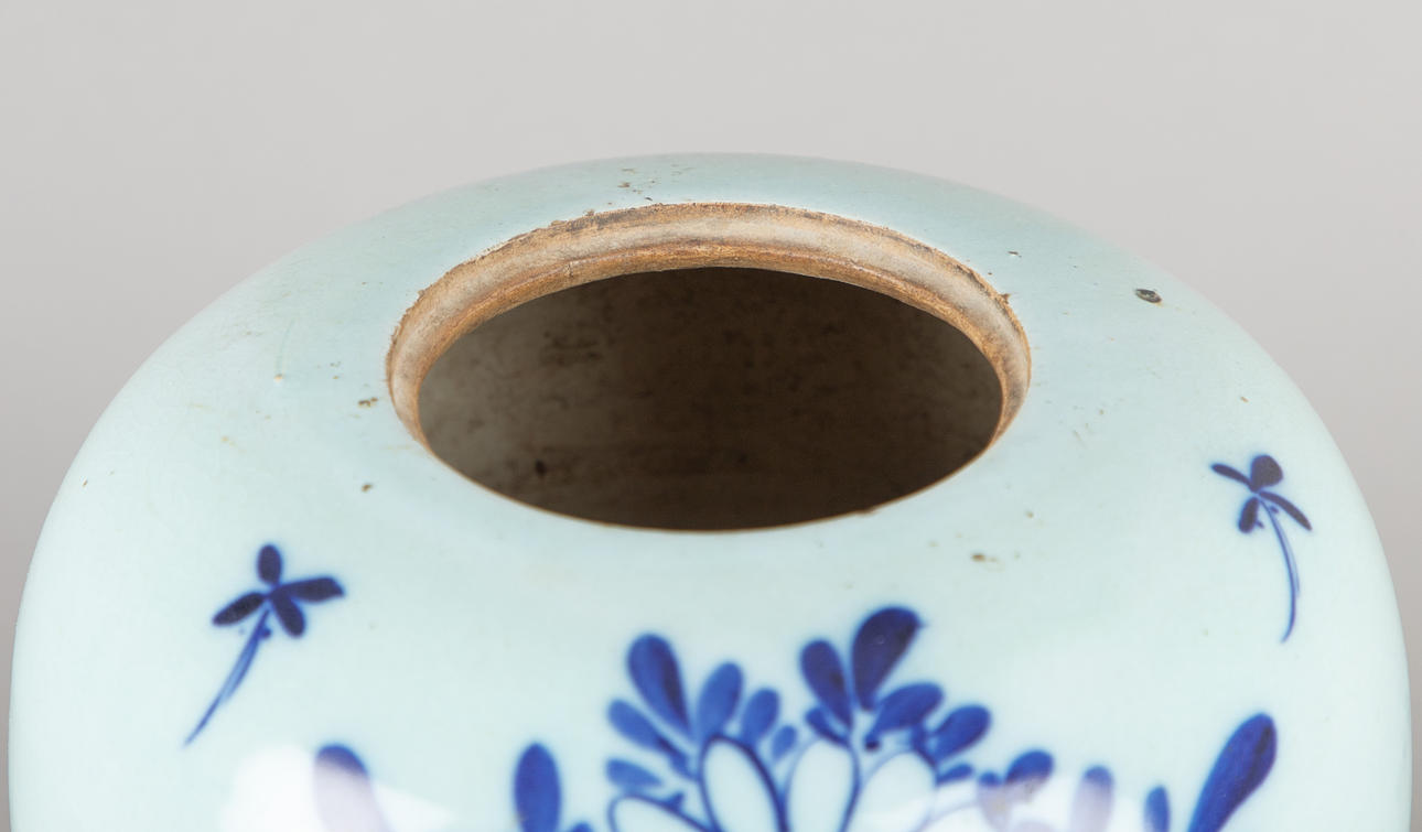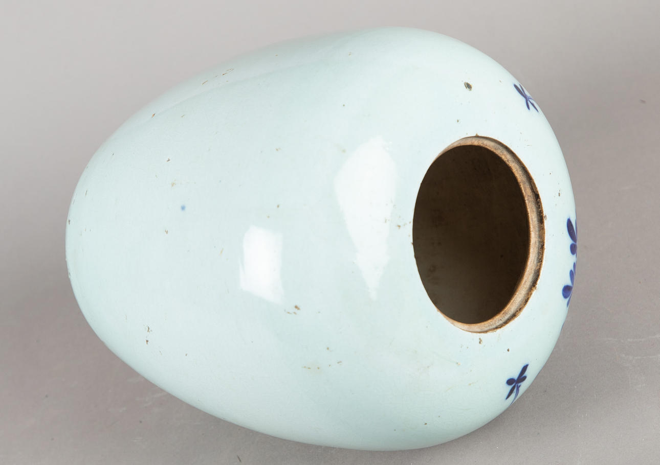 Stengods målat i underglasyrblått. Kropp i form av en vaxpumpa Samlarbara antika vaser med blommor på celadon bakgrund på framsidan. HxDM.: ca 28 x 22 cm.