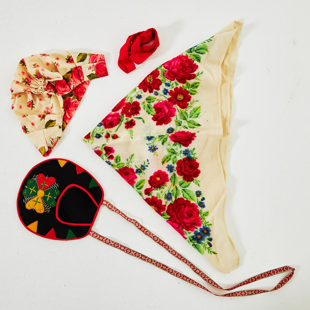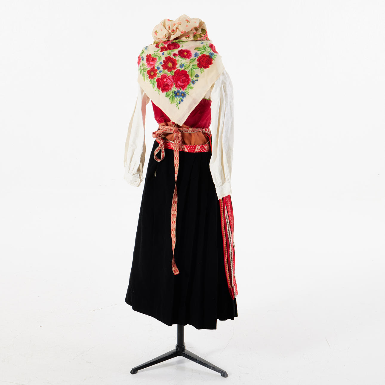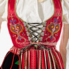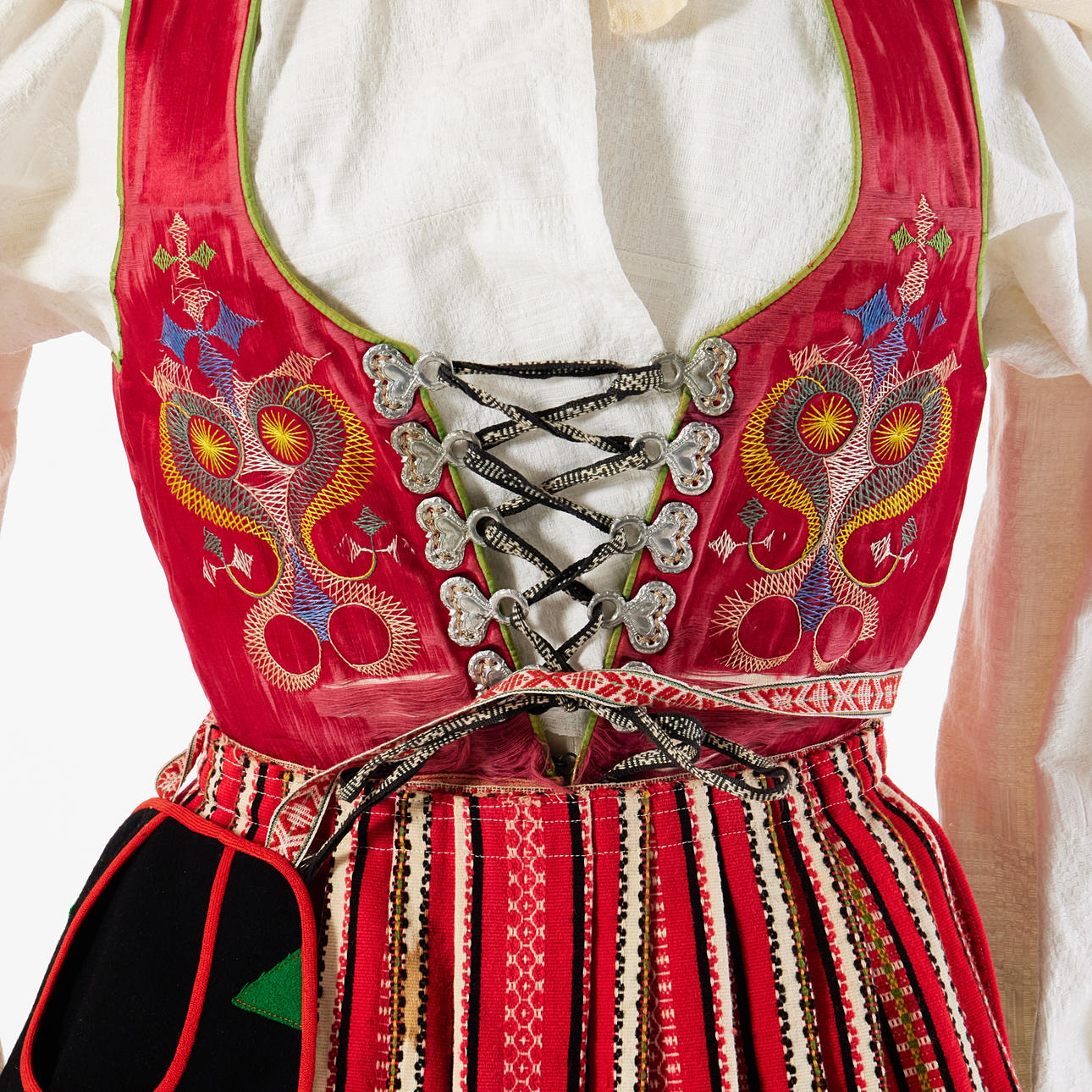 7 delar bestående av: svart yllekjol, livstycke i röd satin, förkläde, kjolsäck, sjal samt roshätta,
