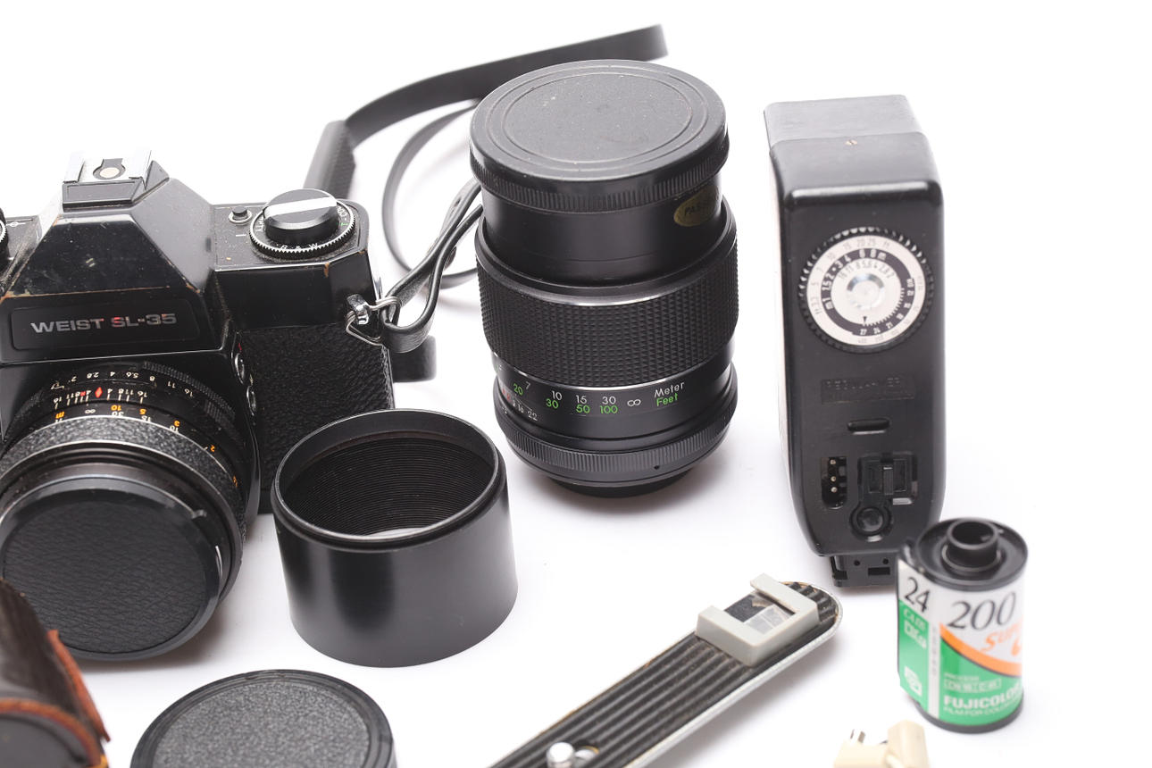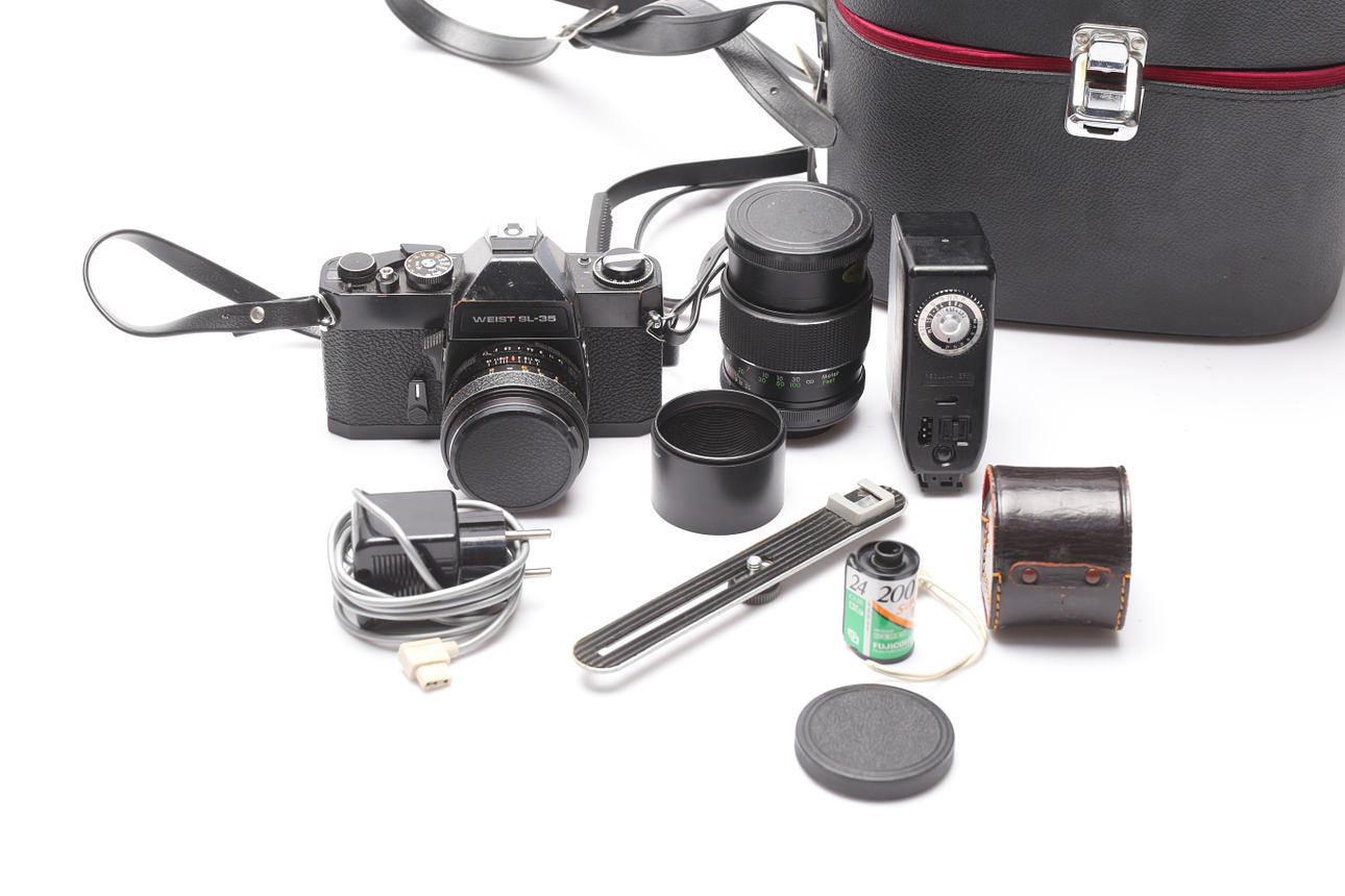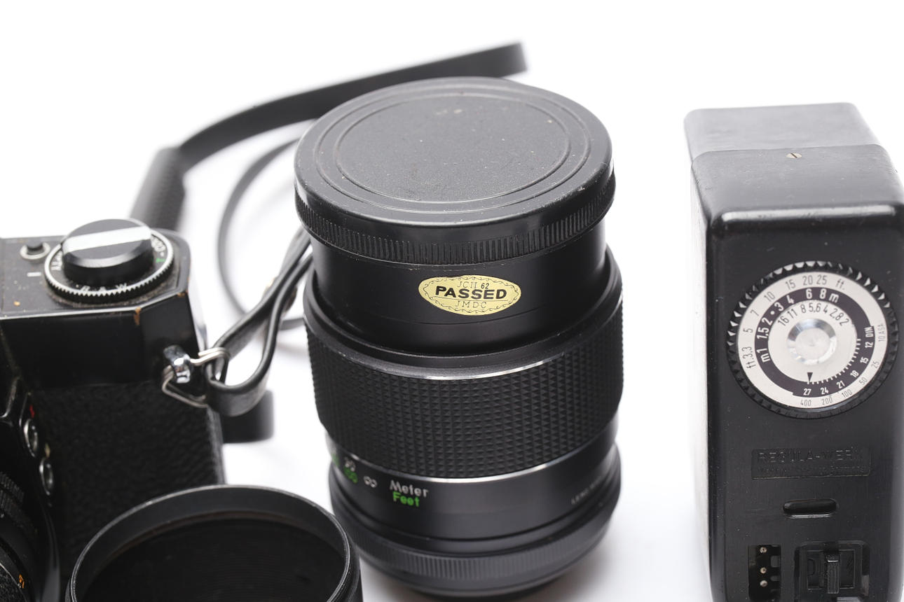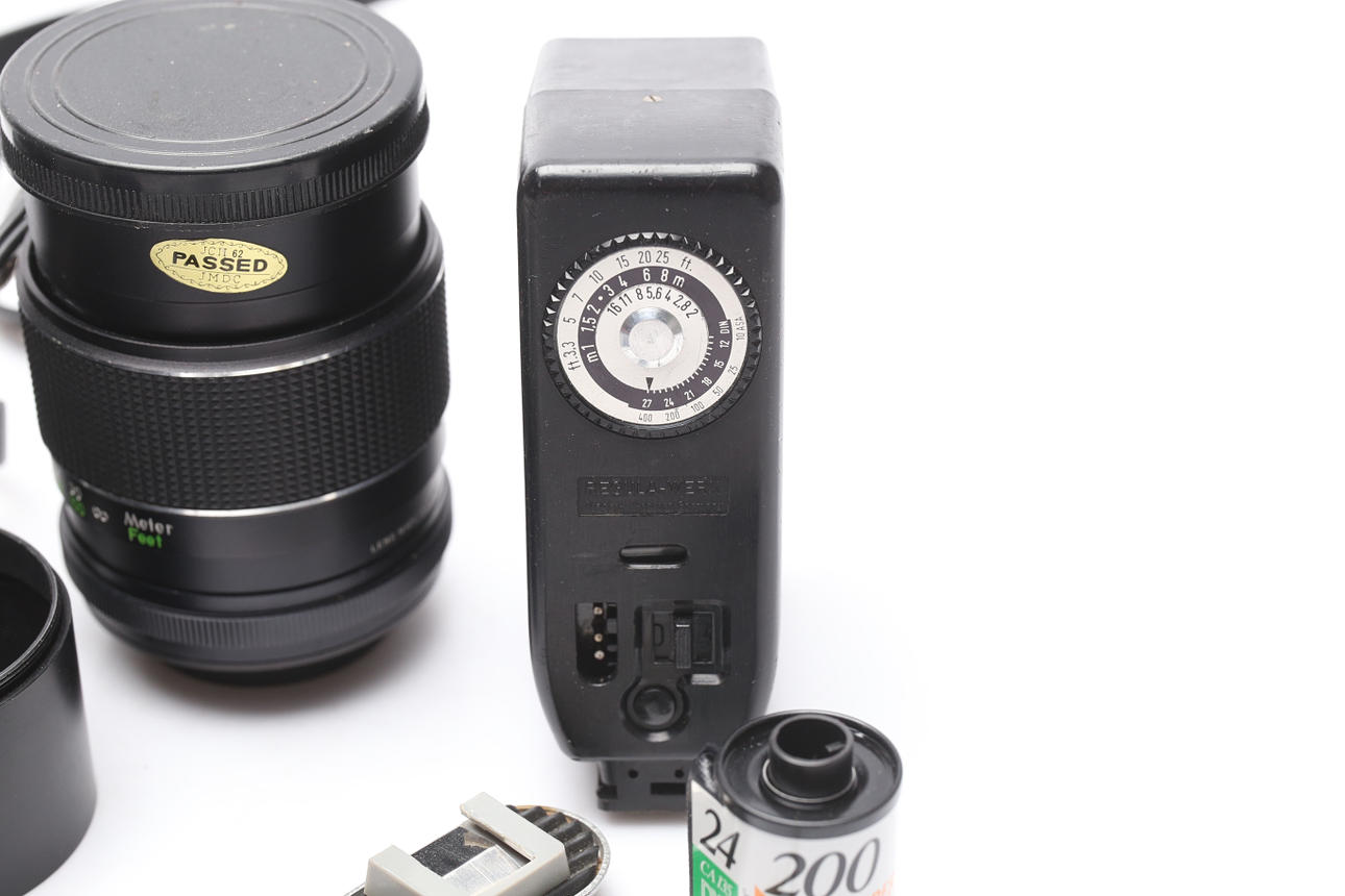 I väska. Objektiv, blixt.