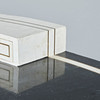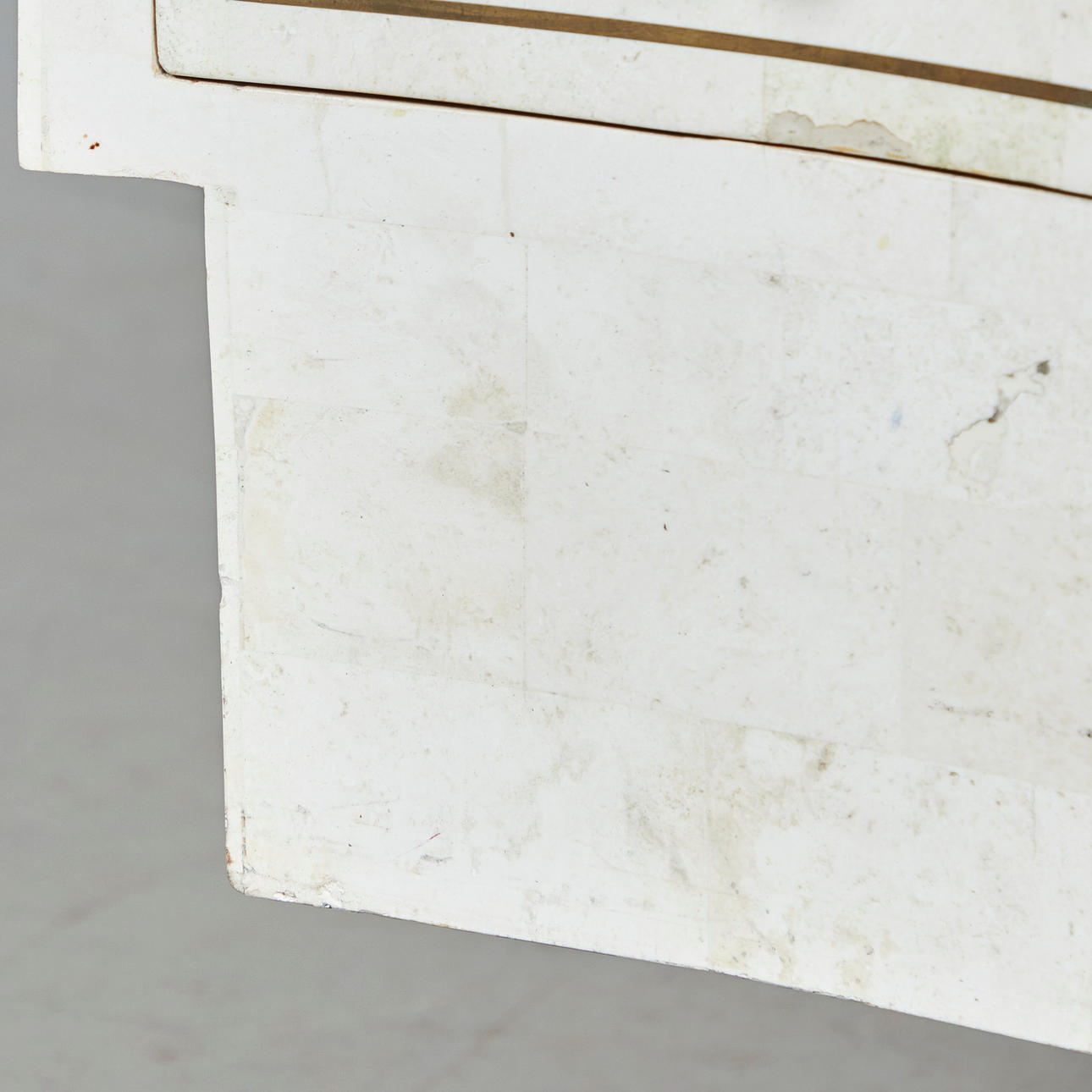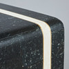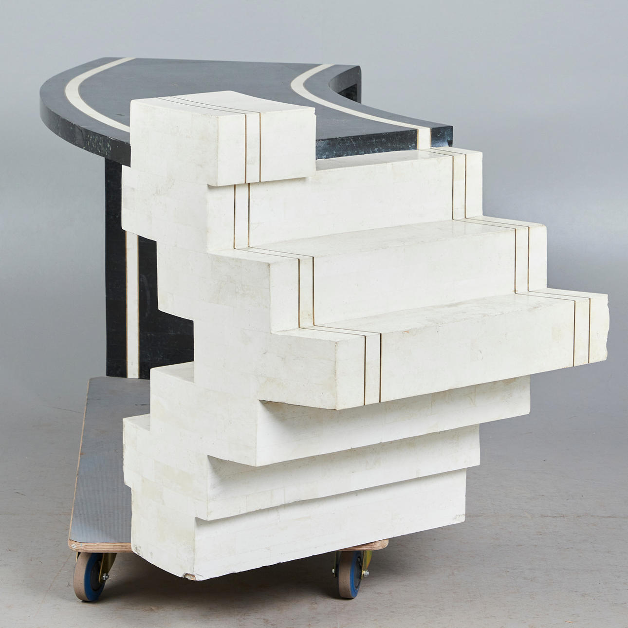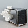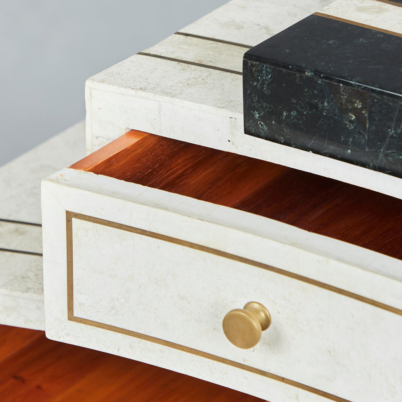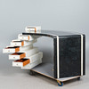 Skrivbord, trä, sten, mässing. Träkonstruktion med vit och svart stenfanér, dekorerad med inlägg i mässing, med sex offsetlådor, H.77cm, L.175cm, W.70cm.