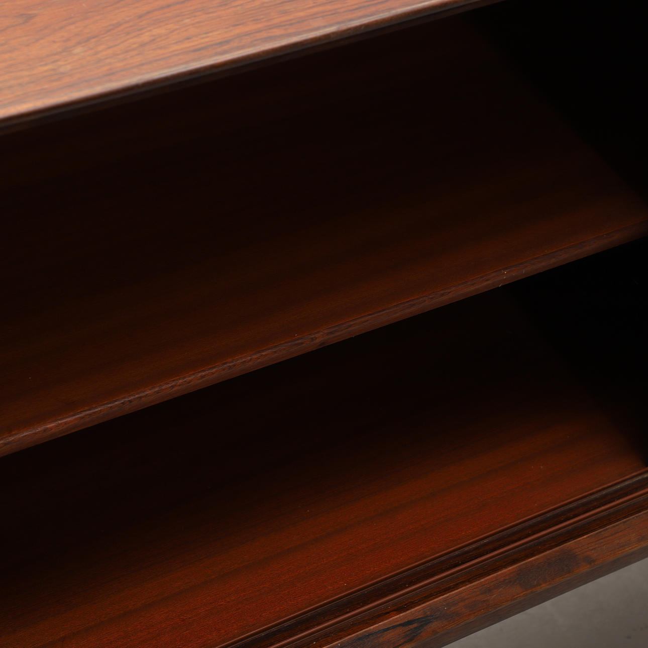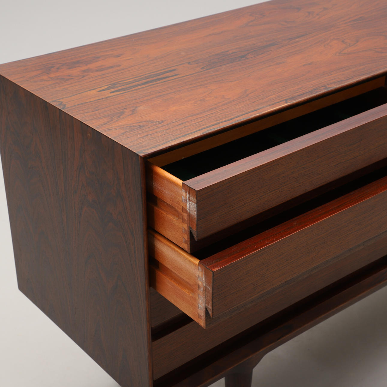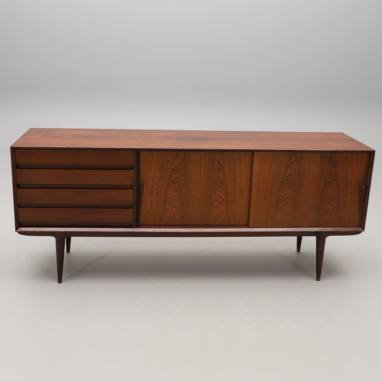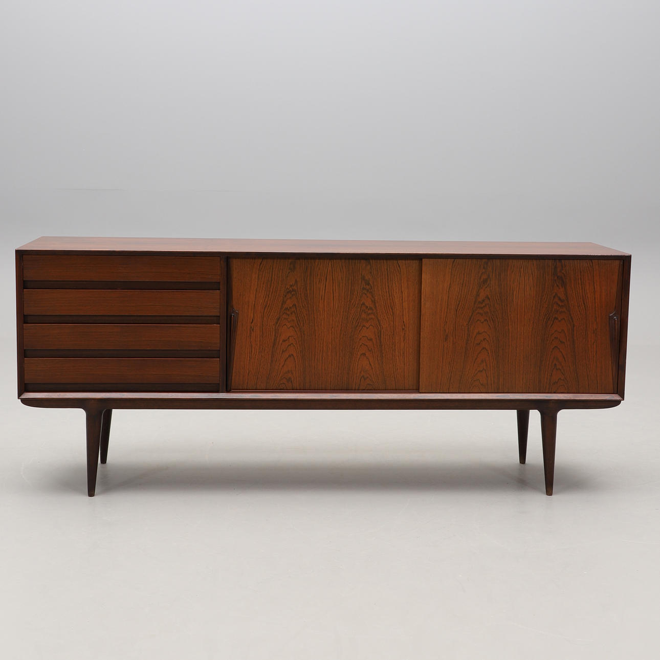 Jakaranda. I fronten två skjutdörrar och fyra lådor. Längd 200, djup 48, höjd 83 cm.