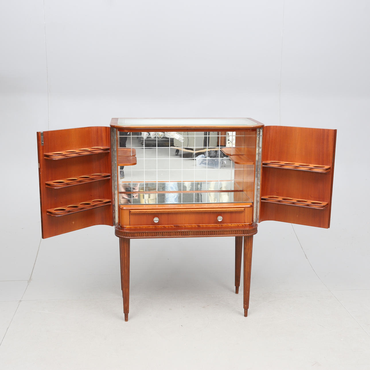 Fanerad med mahogny. Välvda dörrar med bakomliggande barinredning/lådor. Spegelklädd insida. Delvis frostad glasskiva med randdekor på ovansida. Integrerad belysning. Längd ca 85, bredd 44, höjd 114 cm.
