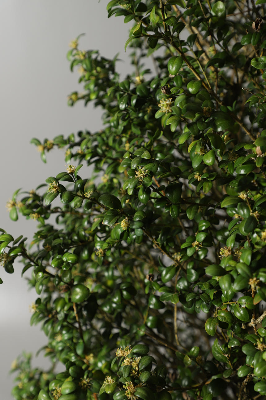 I en konform, sittande i en plastplanter. Total höjd 168cm x Diameter 58cm.
