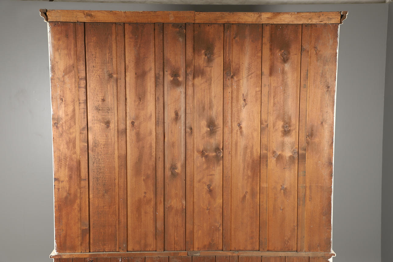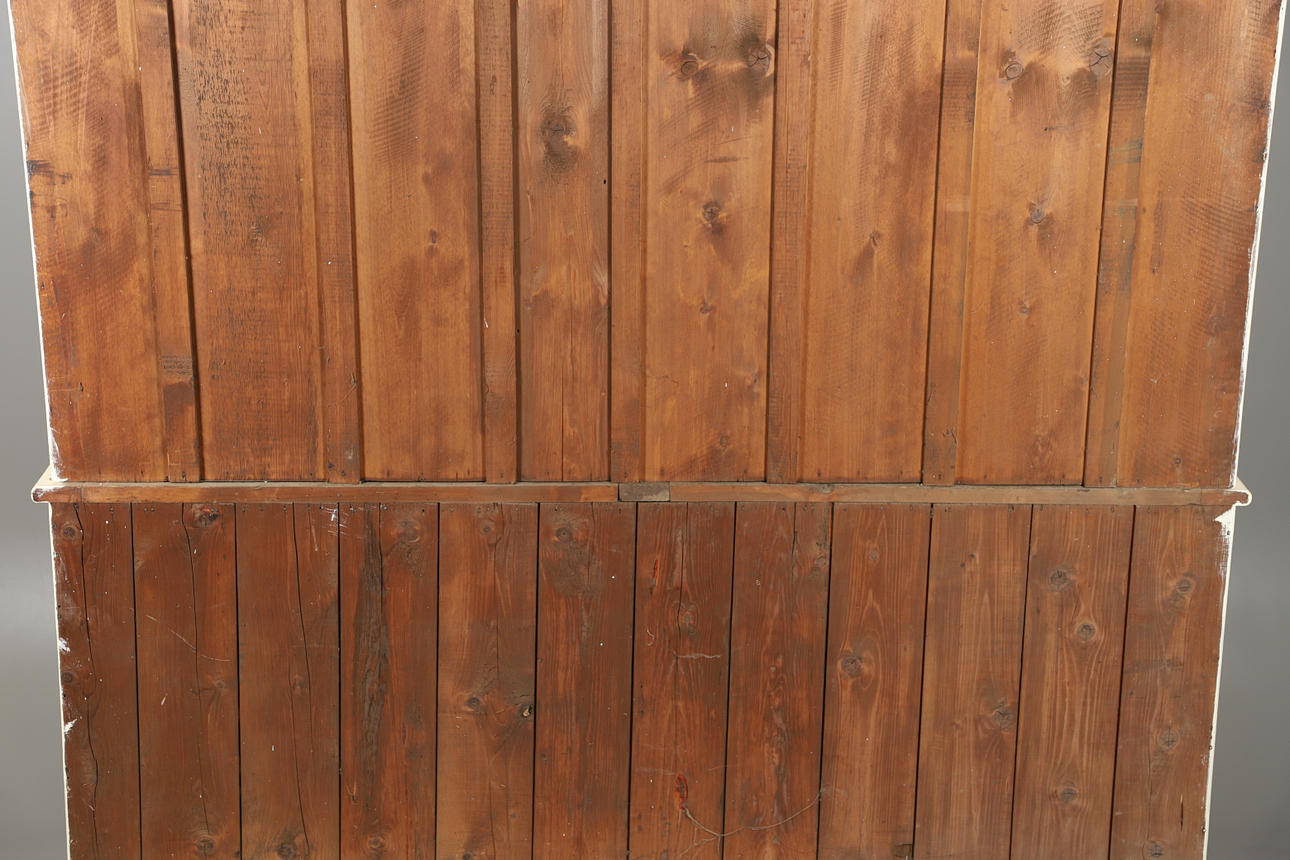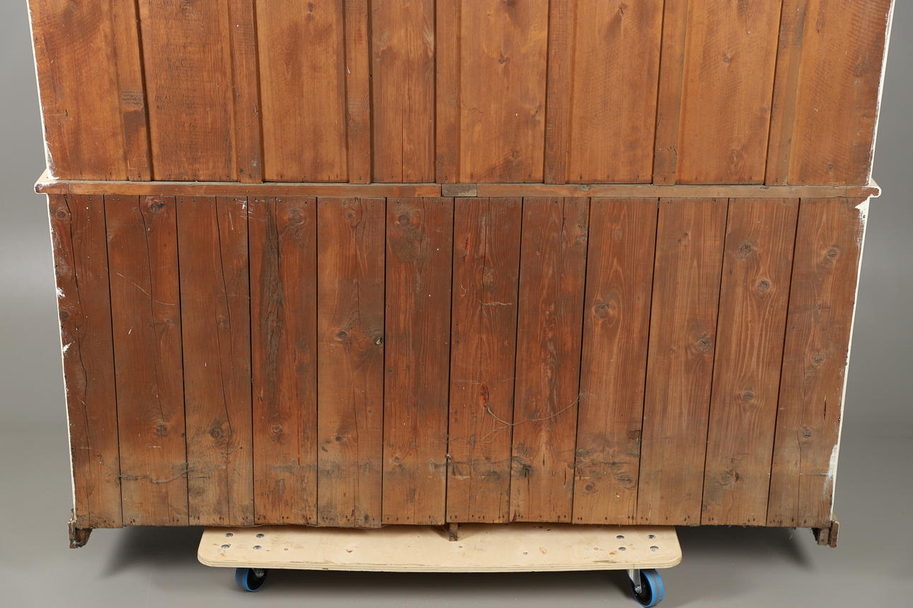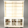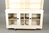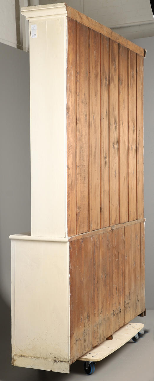 Basenheten med två separerade skåp med glaserade dörrar (Dubbel och en singel), med en enda inre hylla inom. Dörrar har säkringsspärrar. Den övre enheten innehåller åtta individuella hyllor som kan placeras efter användning. Målad vit. Höjd 257cm x Längd 194cm x Djup 48cm.
