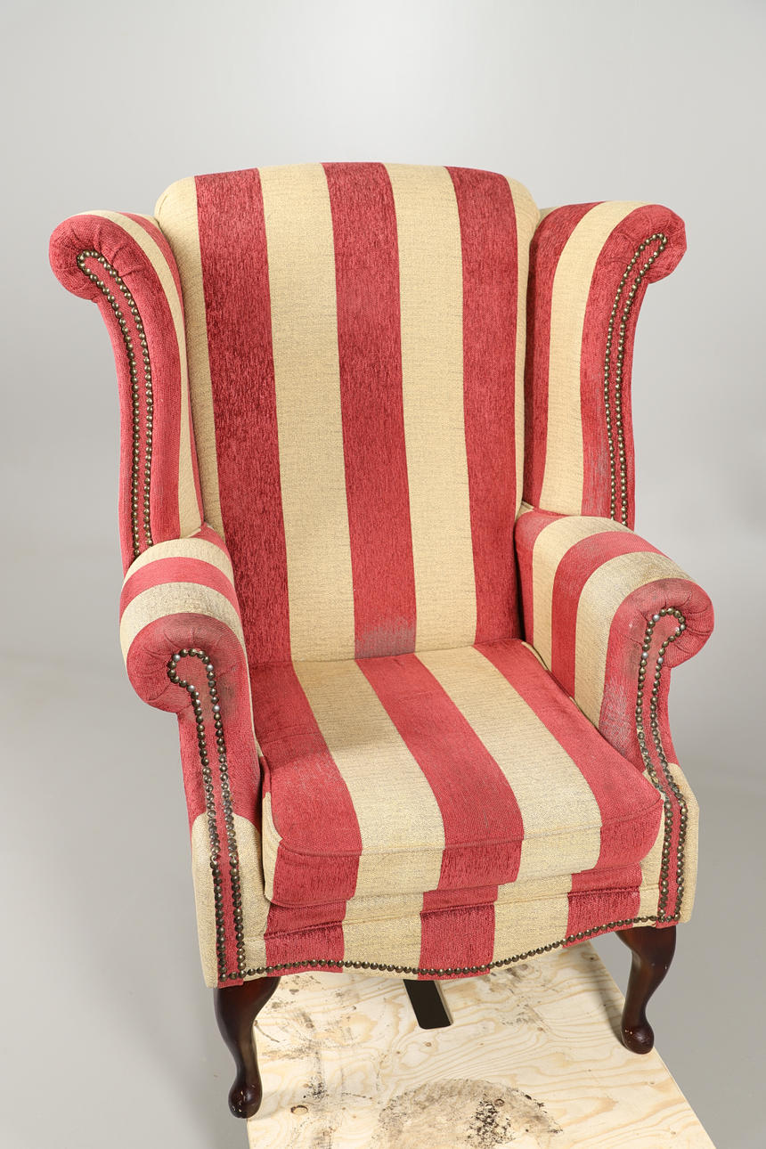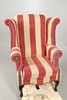 Med mässingsdekorerad dekor och randig klädsel. Sitthöjd 46cm, Total höjd 122cm.
