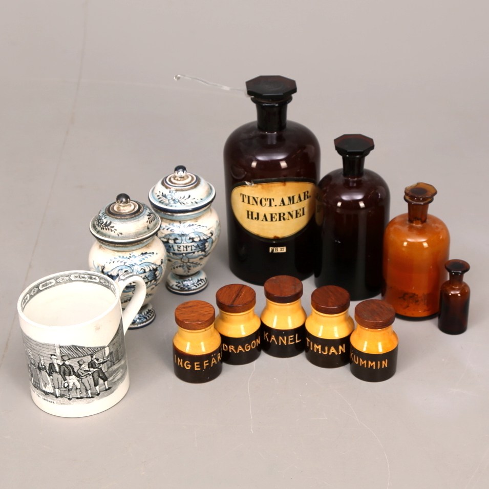 278616. APOTEKSFLASKOR, KRYDDBURKAR, SEJDEL.