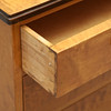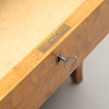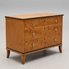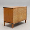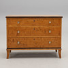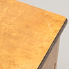 Björkfanerad, delvis brunmålad. Rektangulär skiva, tre lådor med metallknoppar. Bredd 90, djup 45, höjd 68 cm.