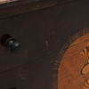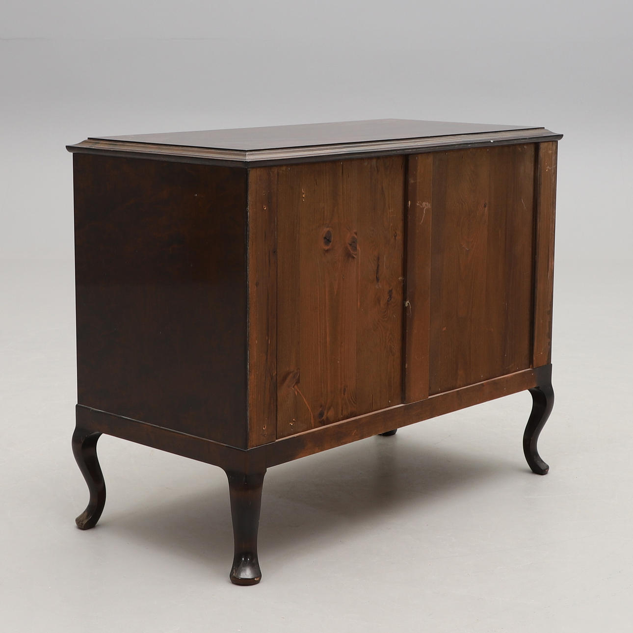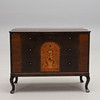 Fanerad med mörkbetsad björk, wenge, almrot m fl träslag. Tre lådor, fronten med intarsiadekor. Svängda ben. Bredd 90, djup 46, höjd 71 cm.