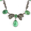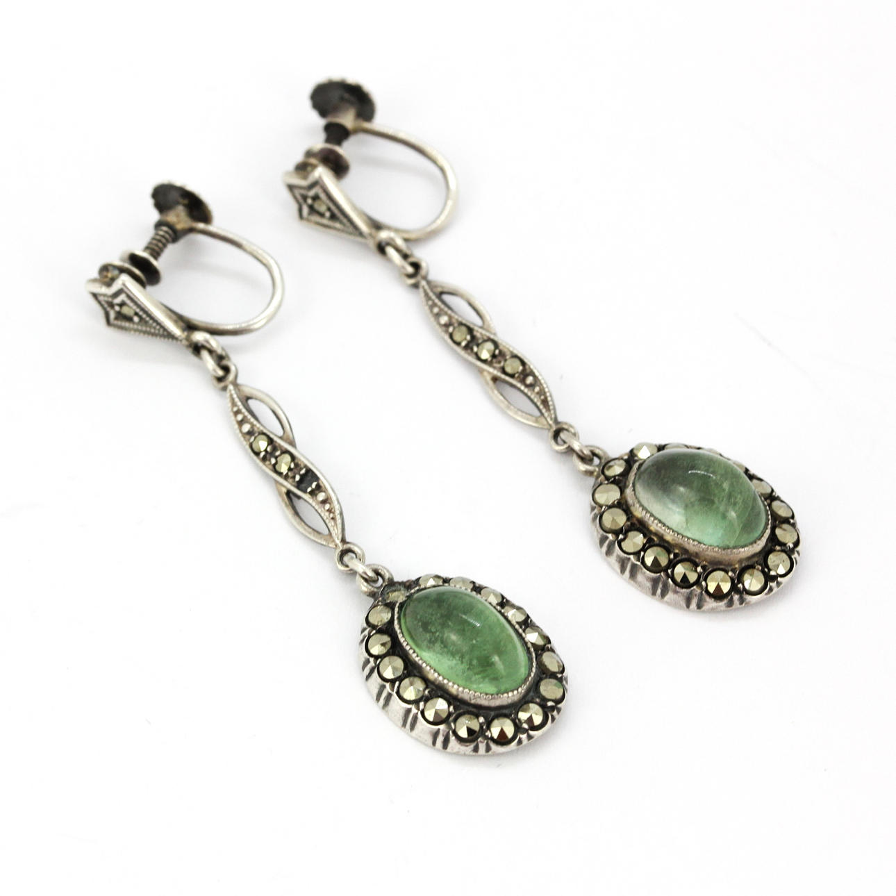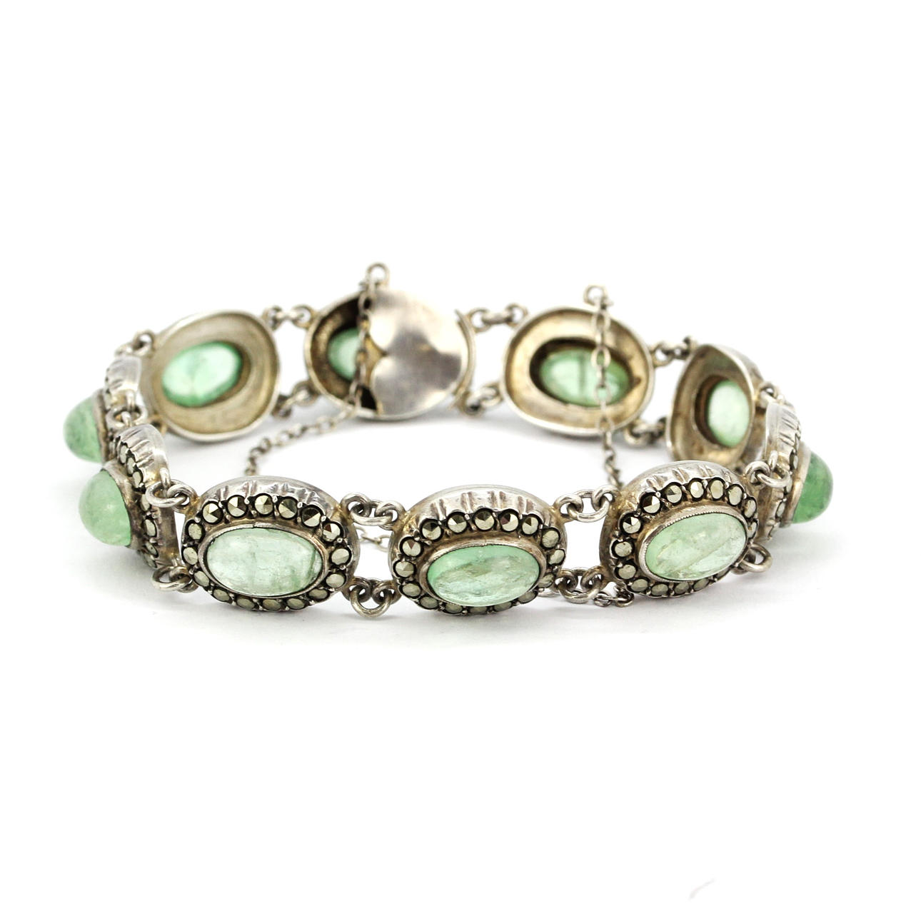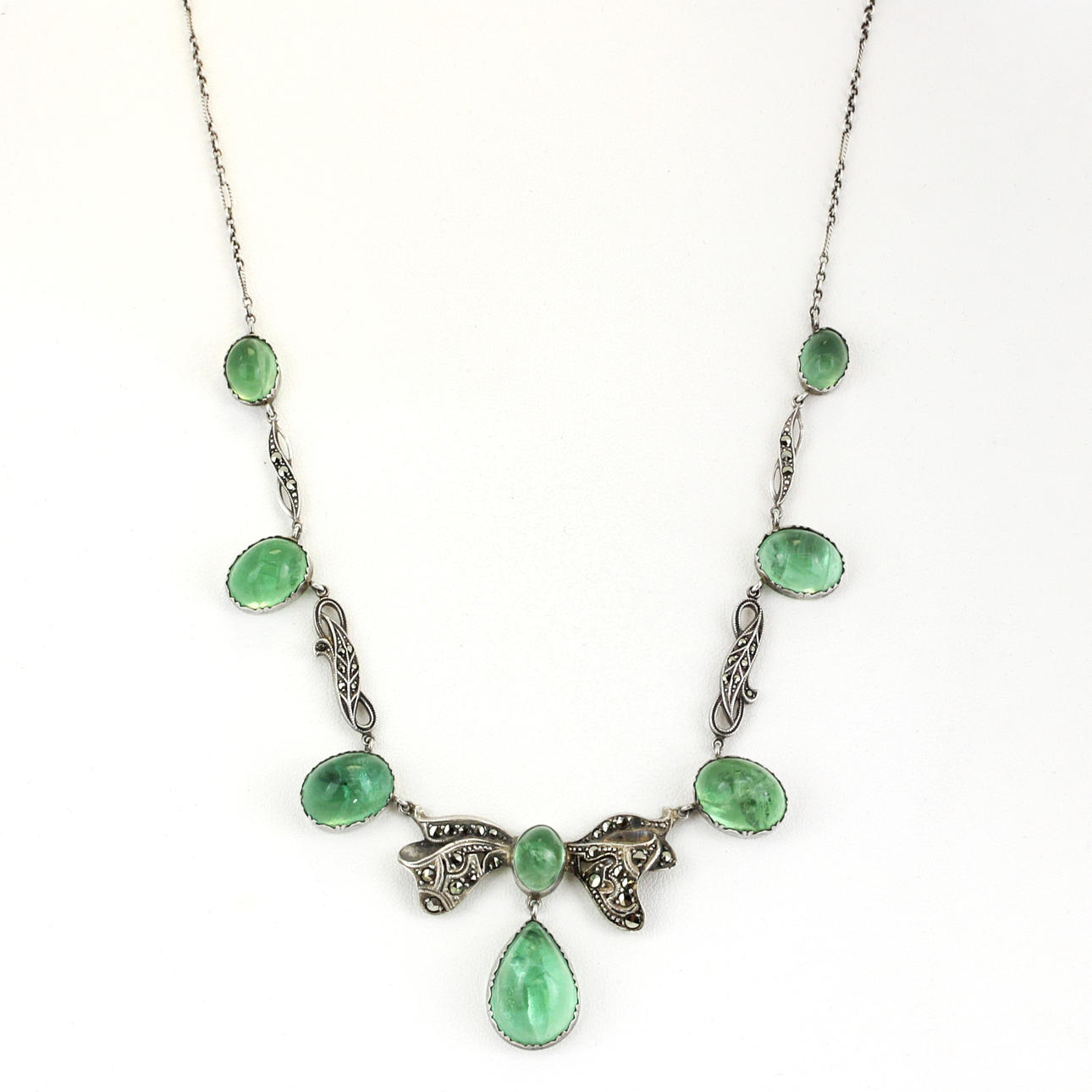 En silversmyckesvit bestående av ett halsband med en rosett drop front, L. 40cm, ett armband, L. 16cm, och ett par drop örhängen alla set med markasit och ovala cabochon gröna stenar.