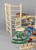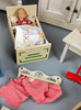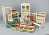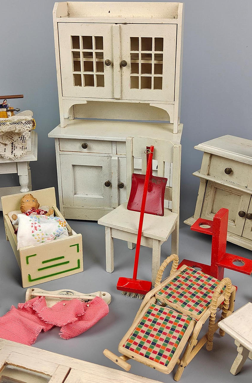 stora vitlackerade trämöbler, en samling av olika köksmöbler för dockhuset, disk, 2 trebladiga fönster, 2 stolar, bänk, vägghylla med köksredskap, trehjuling, 2 barnstolar, vissa används också som gungstol, gardiner och diverse andra delar.