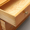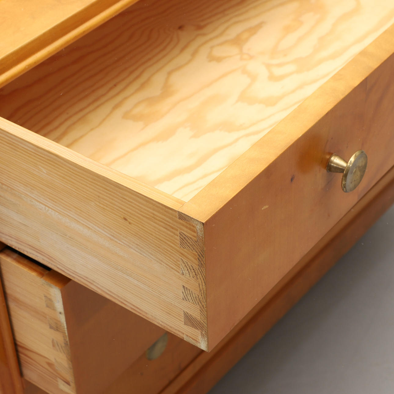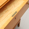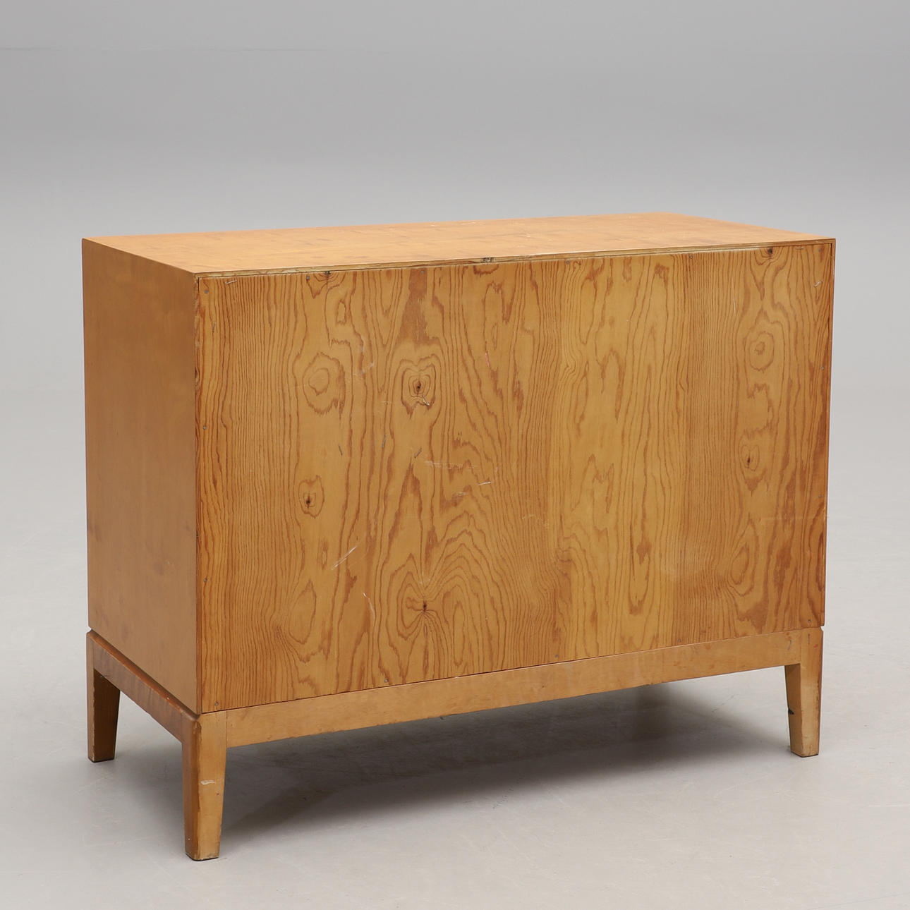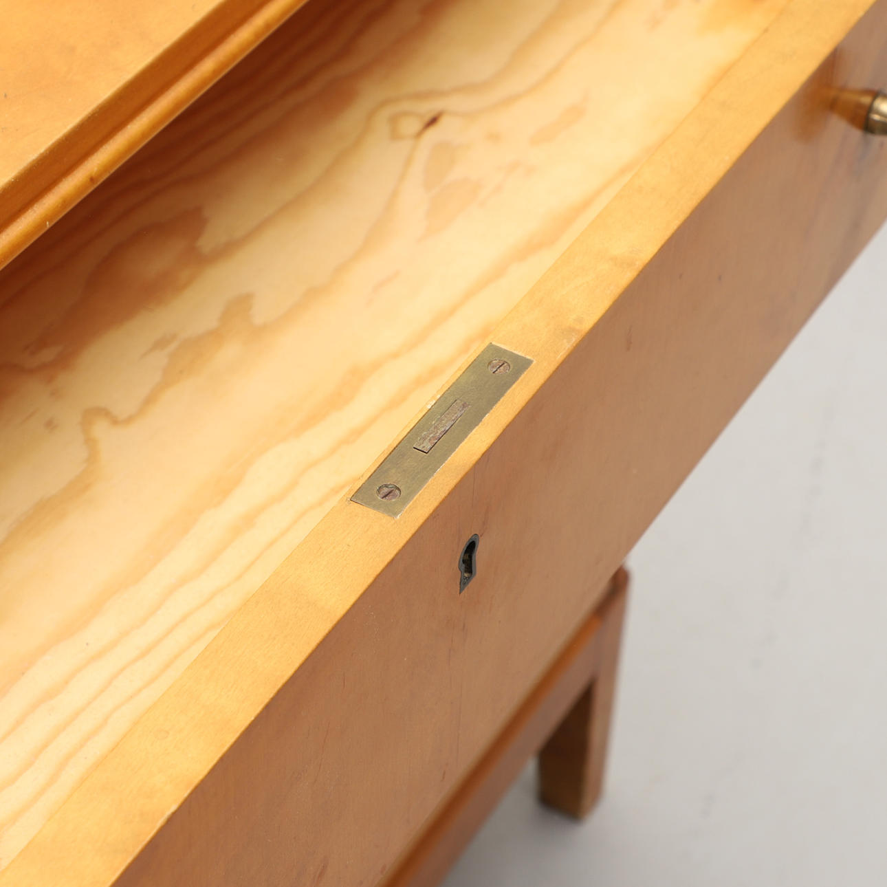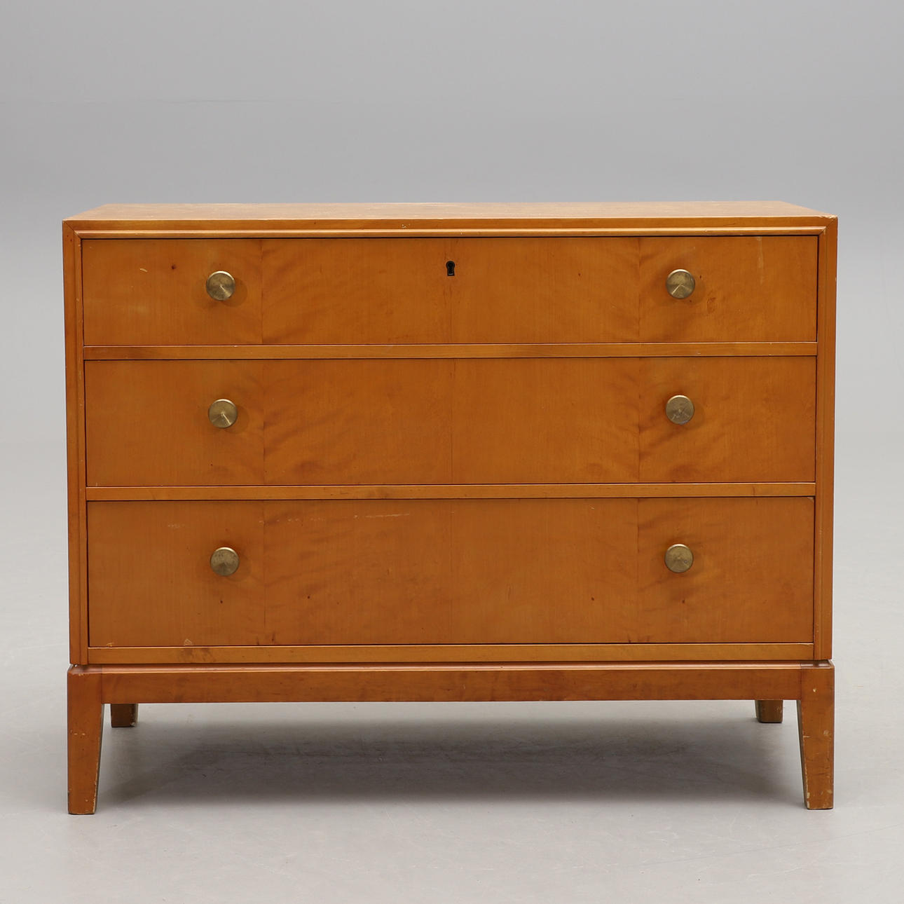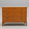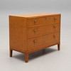 Björkfanerad. Rak form, tre lådor, metallbeslag. Bredd 90, djup 44, höjd 71 cm.