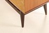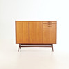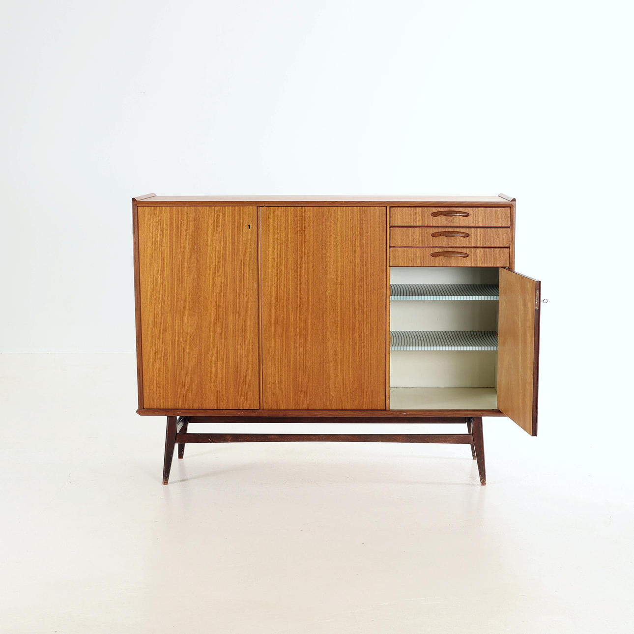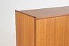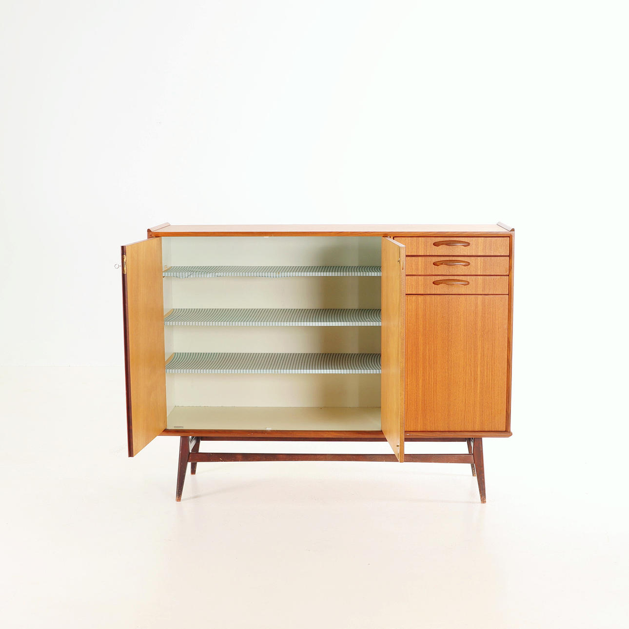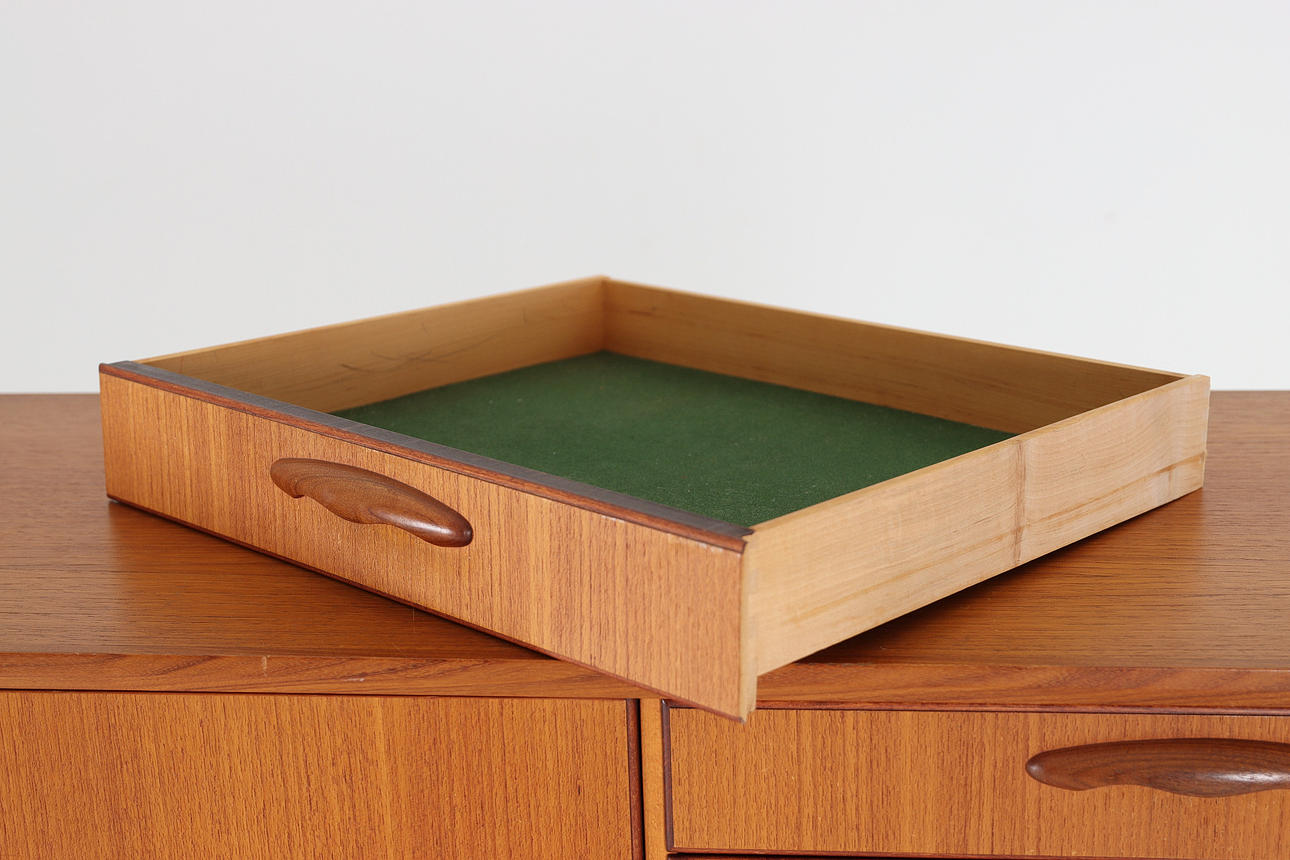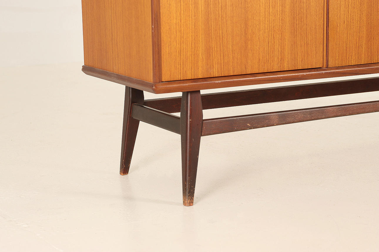 Sideboard/skåp, teak, lös benställning betsat trä. Tre st lådor, skåpsdörrar med bakomliggande hyllplan.