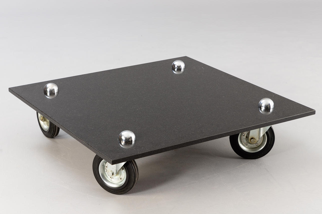 Soffbord i granit på hjul, 1980-tal. Konstruerad av en 2 cm tjock svart granitplatta med 4 hjul. Kan demonteras.