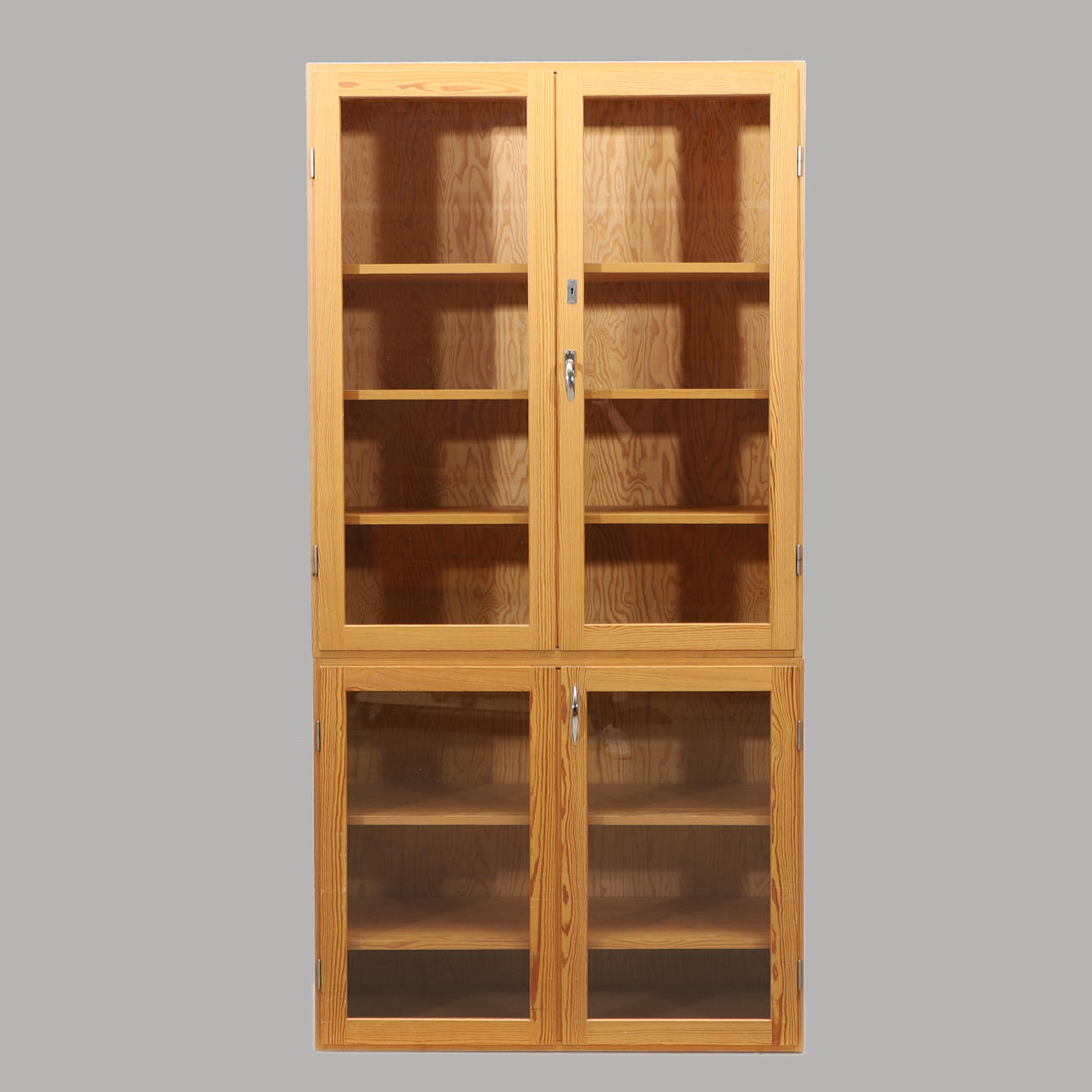 Furu. Tvådelat. I fronten fyra vitrindörrar. Inredning med flyttbara hyllplan. Bredd 100, djup 46, höjd 81+120=201 cm.