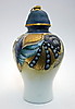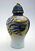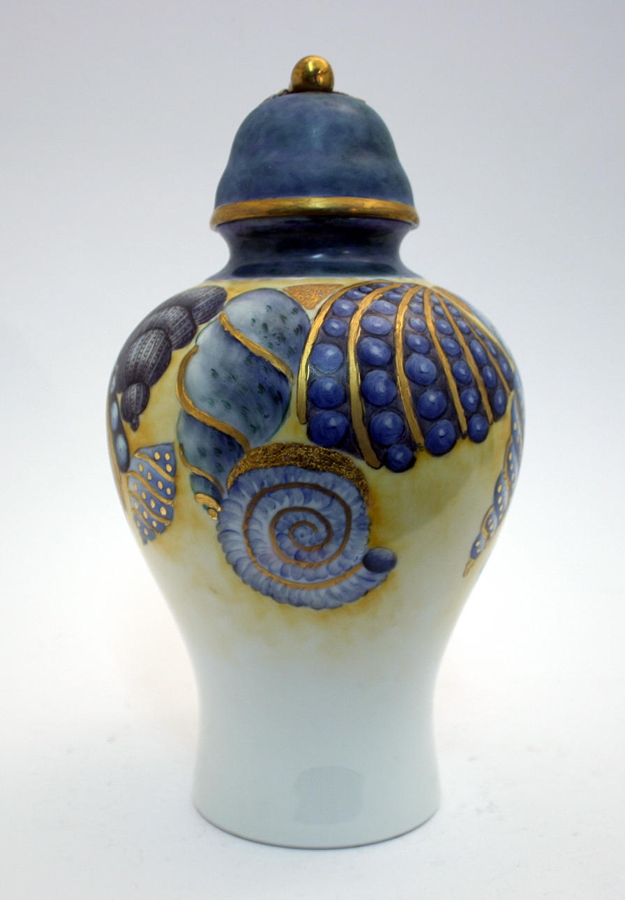 Denna lockvas mäter ca.. 30 cm i höjd och är ett mycket dekorativt porslinsobjekt från slottsfabriken i Ludwigsburg. Den är prydd med trevliga rökiga blå Medelhavsskal i färgerna blått, grönt och guld. Lockstycket är dekorerat med en liten päronform med blad i guld.