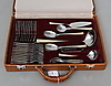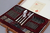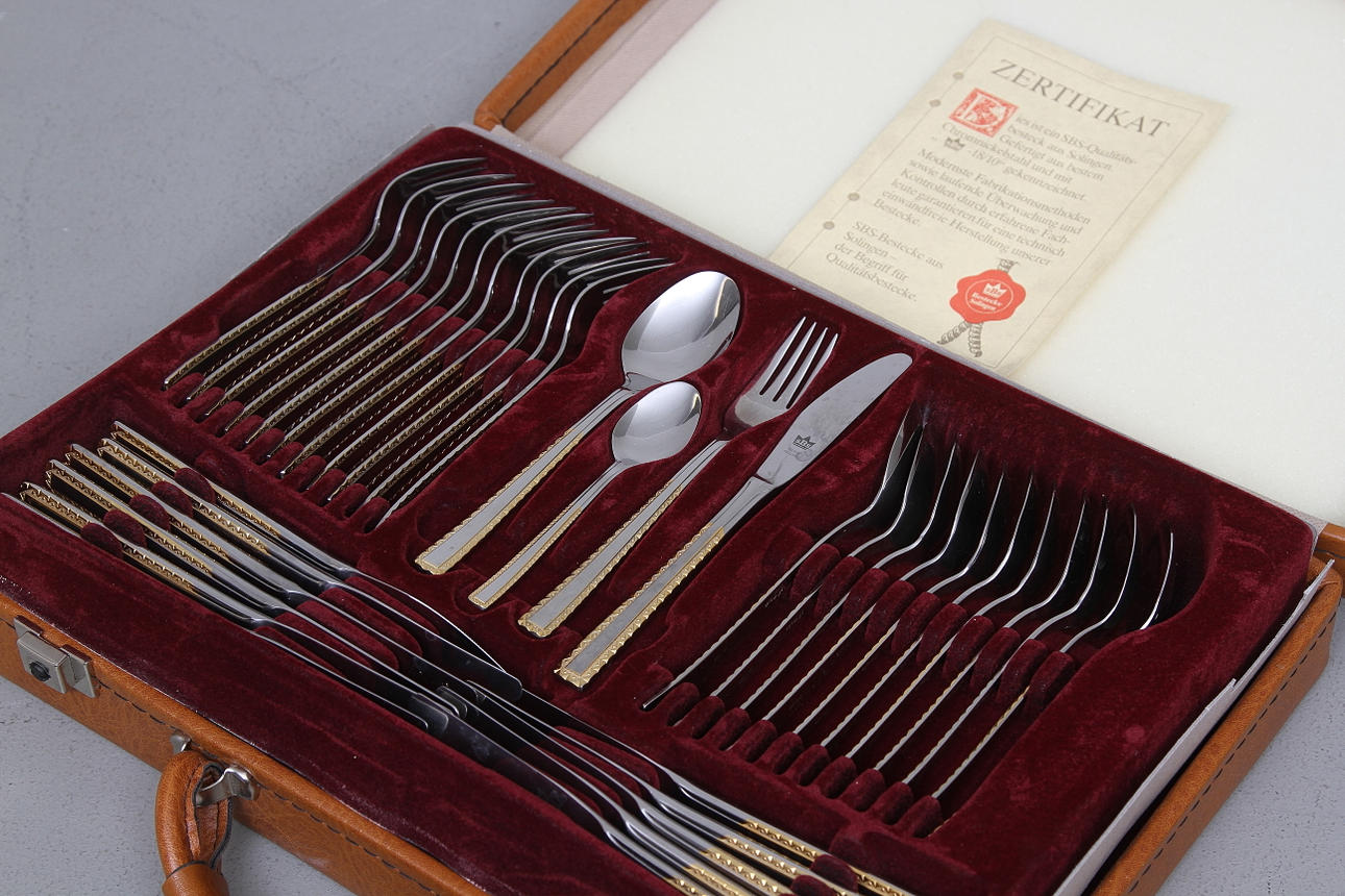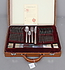 12 matgafflar, 12 bordsknivar, 12 matskedar, 12 dessertskedar, 12 bakelsegafflar, 2 serveringsgafflar, syltsked, 3 serveringsskedar, såssked, soppsked, tårtspade, sockertång.
