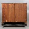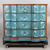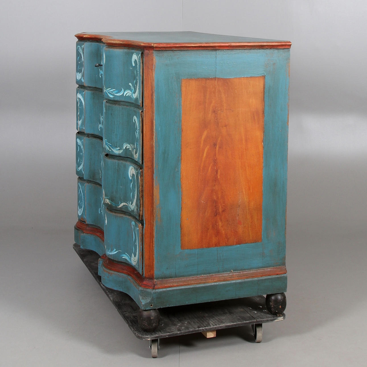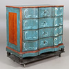 Fyra draglådor i böljande form. Kulsvarvade fötter. Senare bemålad.