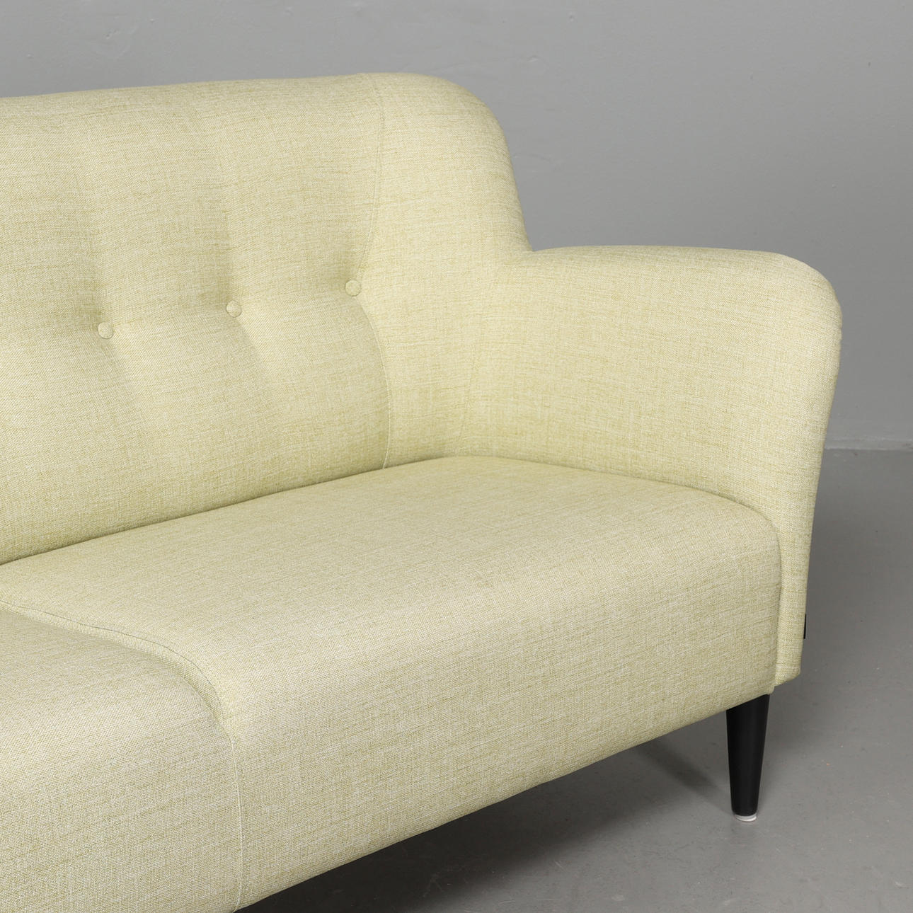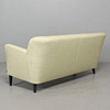 Tvåsits soffa helstoppad och klädd i grön textil, på svartlackerade ben i trä. Etikettmärkt.