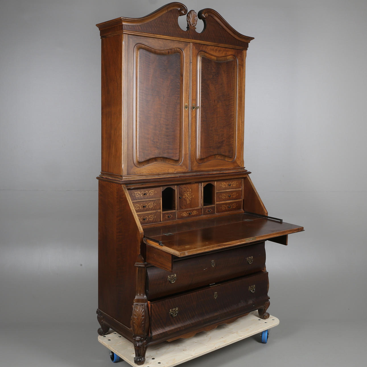 Bruksslitage, repor, slagmärken, trä svällt på nedersta lådan, list på klaff med skada (del finns).