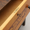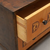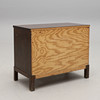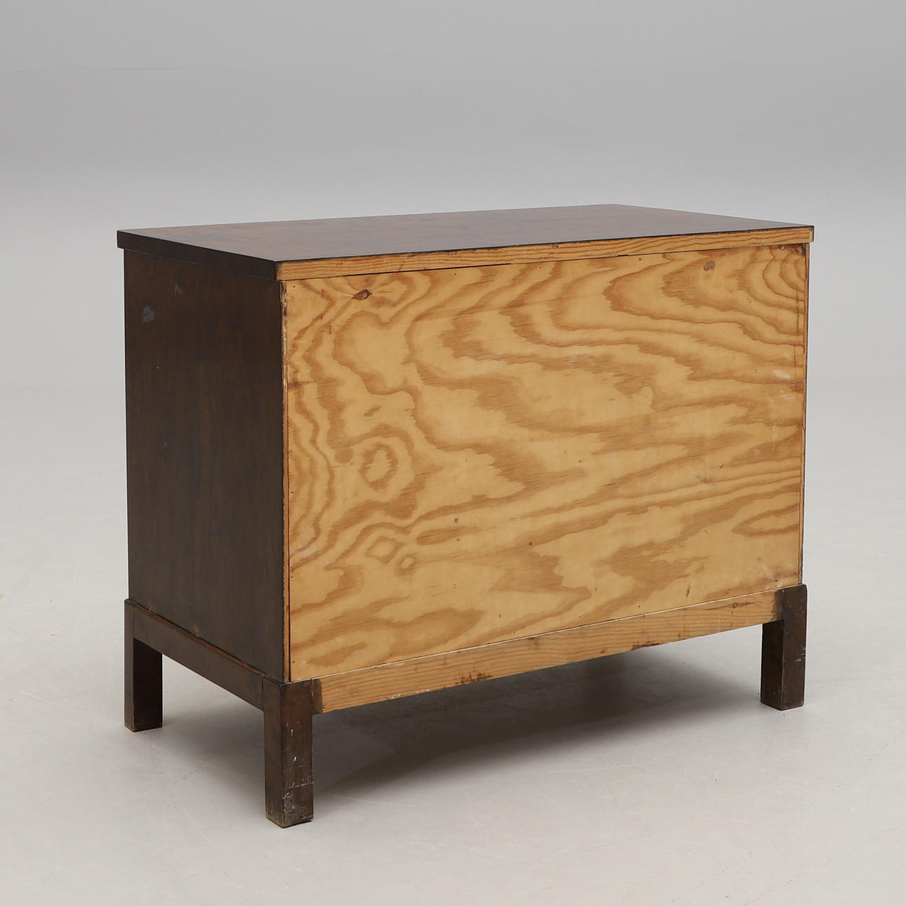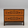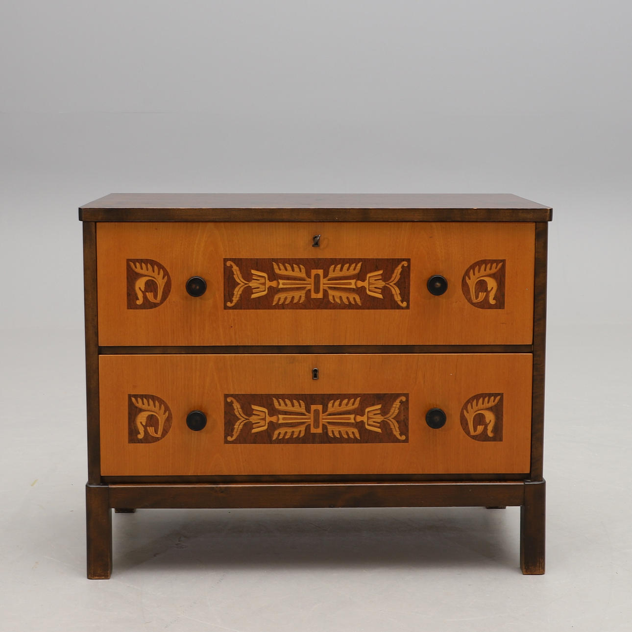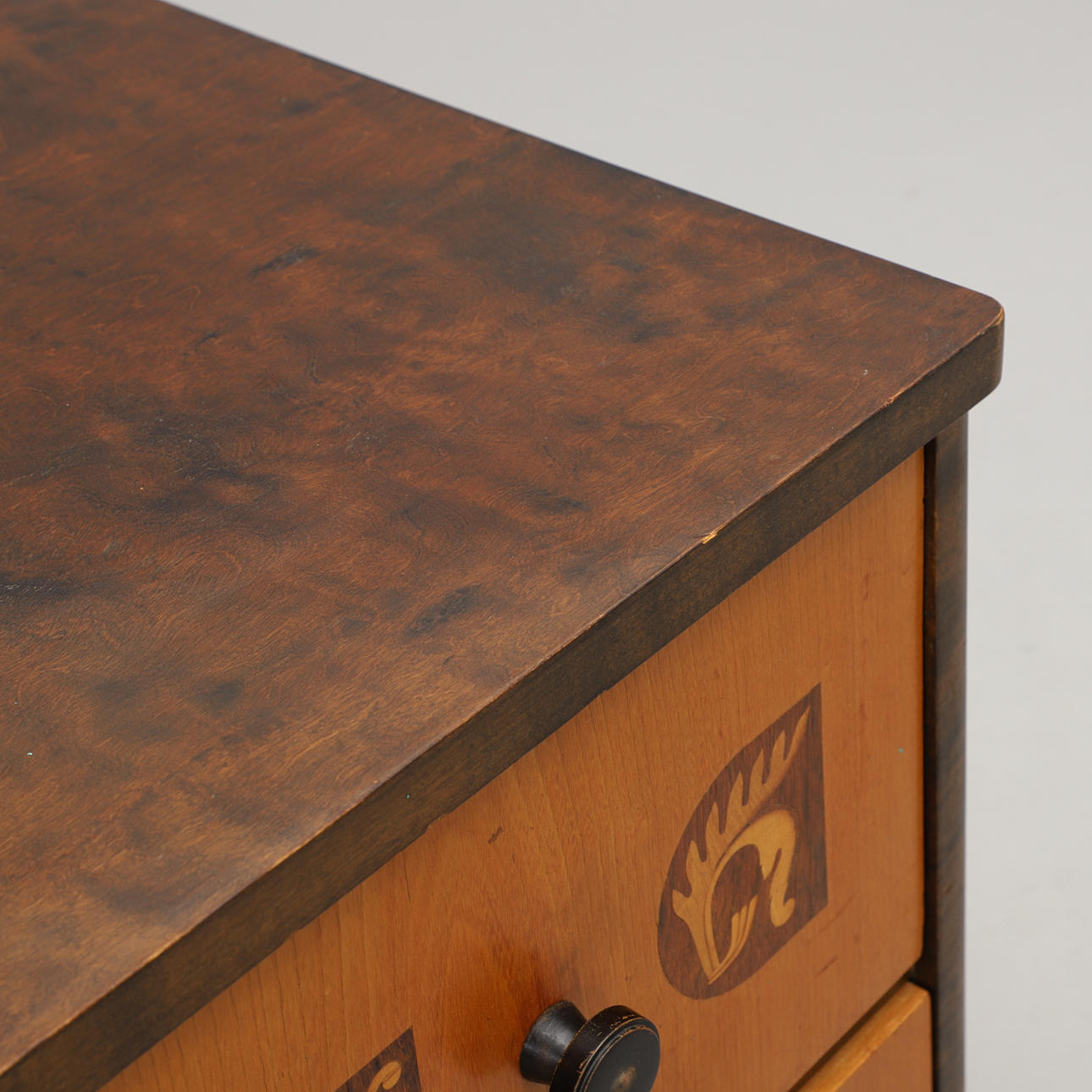 Fanerad med bl a alm och mörkbonad björk. Rak form, två lådor med träknoppar. Stiliserad intarsiadekor. Bredd 86, djup 47, höjd 70 cm.