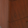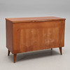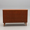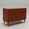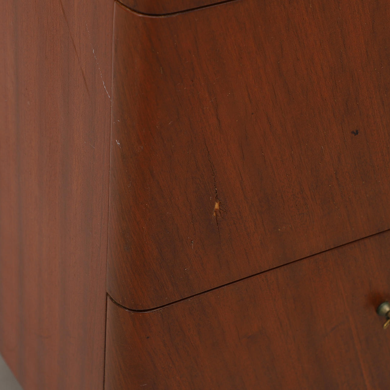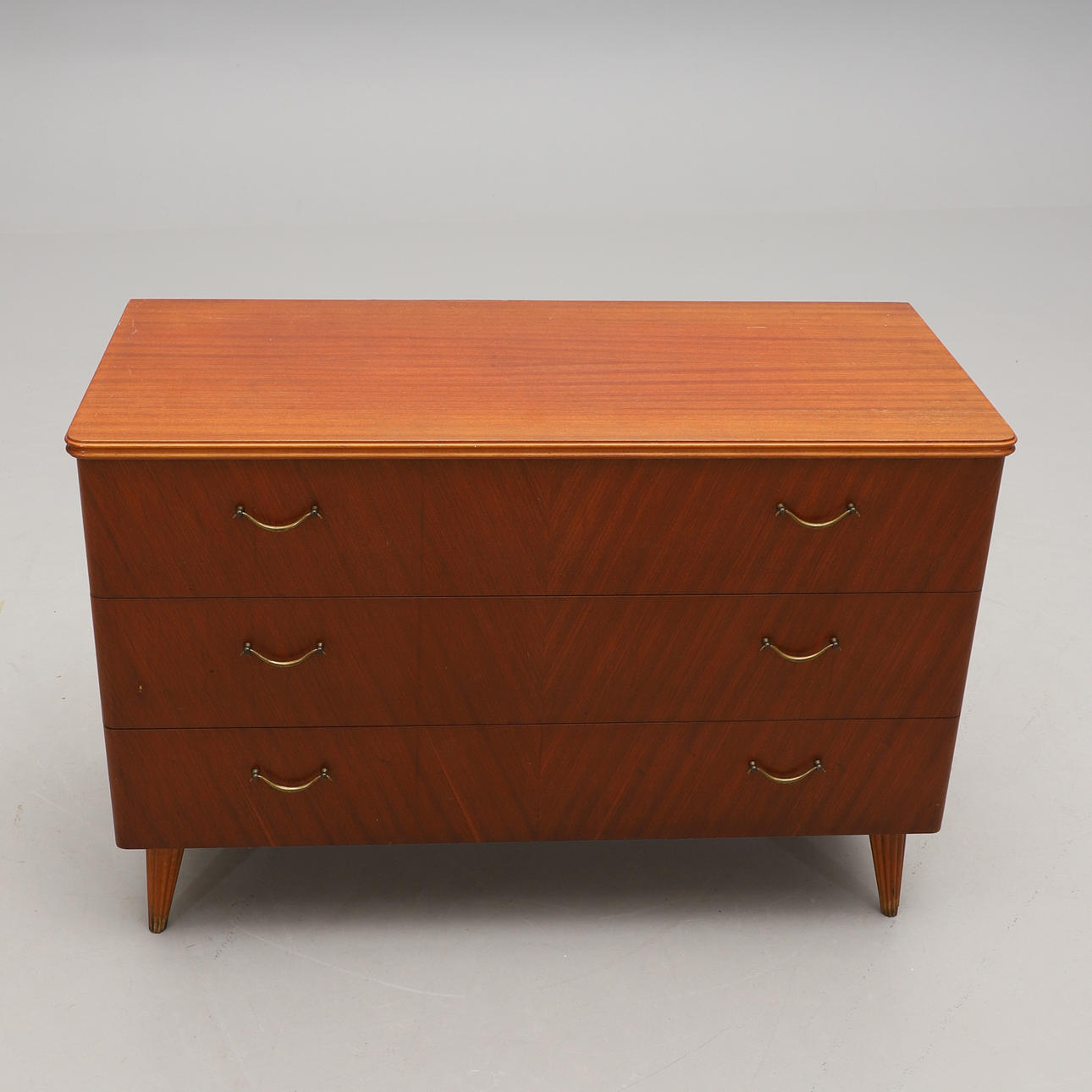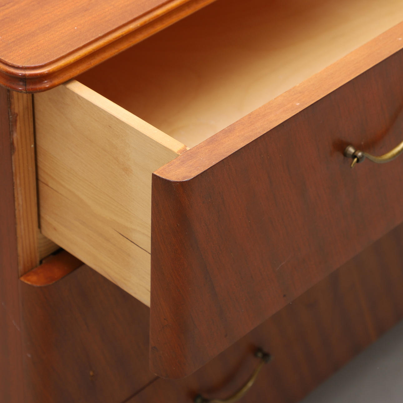 Mahognyfanerad. Tre lådor med mässingsbeslag. Snedställda godronnerade ben. Bredd 102, djup 44, höjd 69 cm.