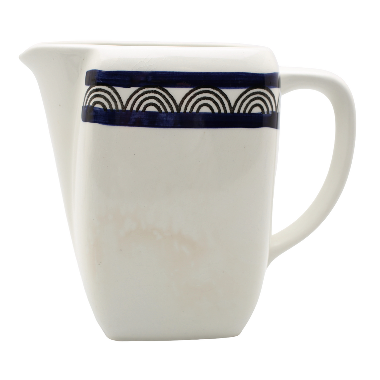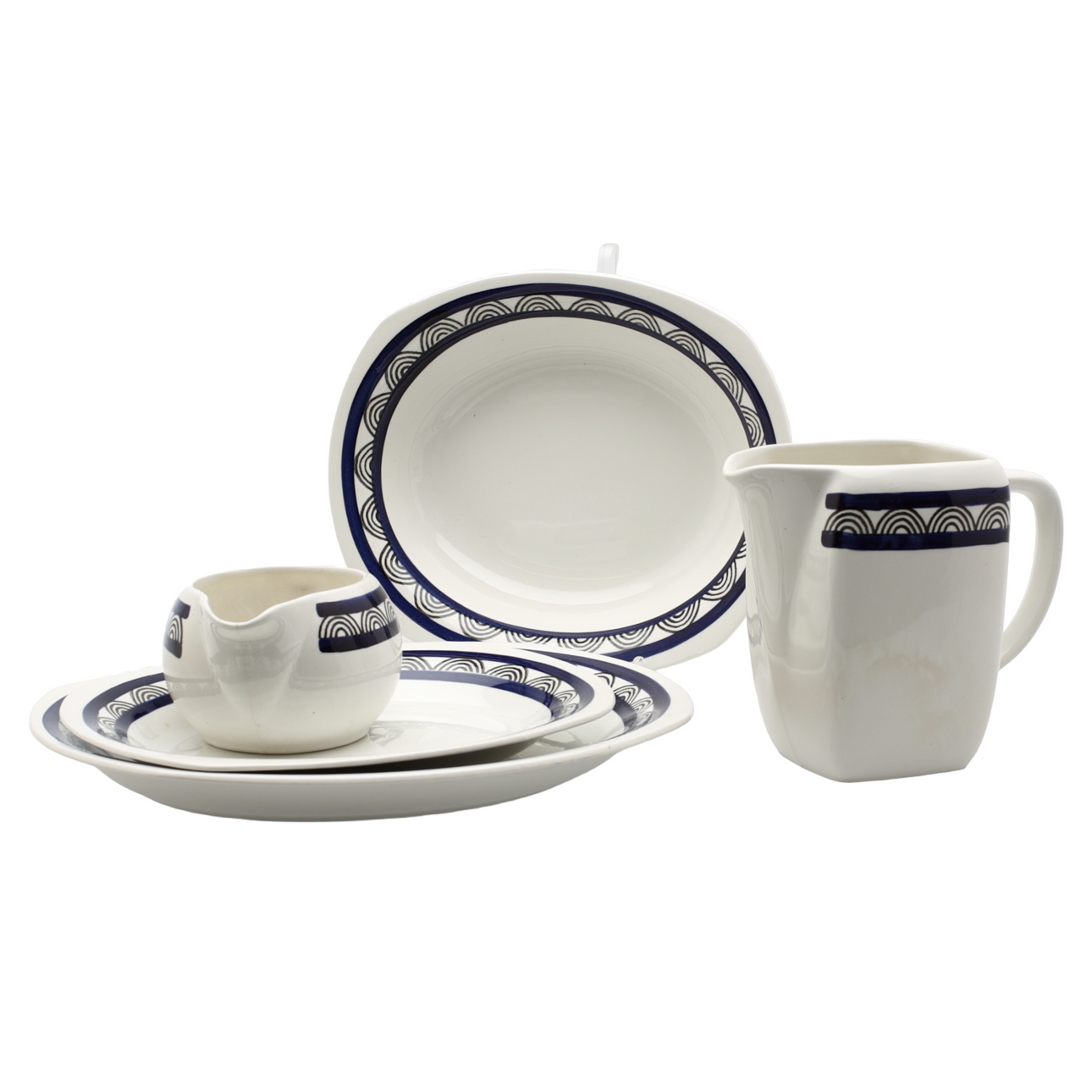 3 st Uppläggningsfat, ca 23,5 - 28,5 cm. 1 st Kanna, höjd 14 cm. 1 st Gräddsnipa, höjd 8 cm.