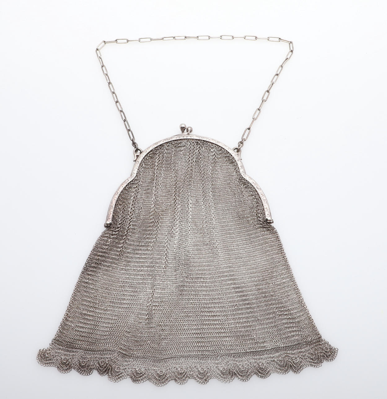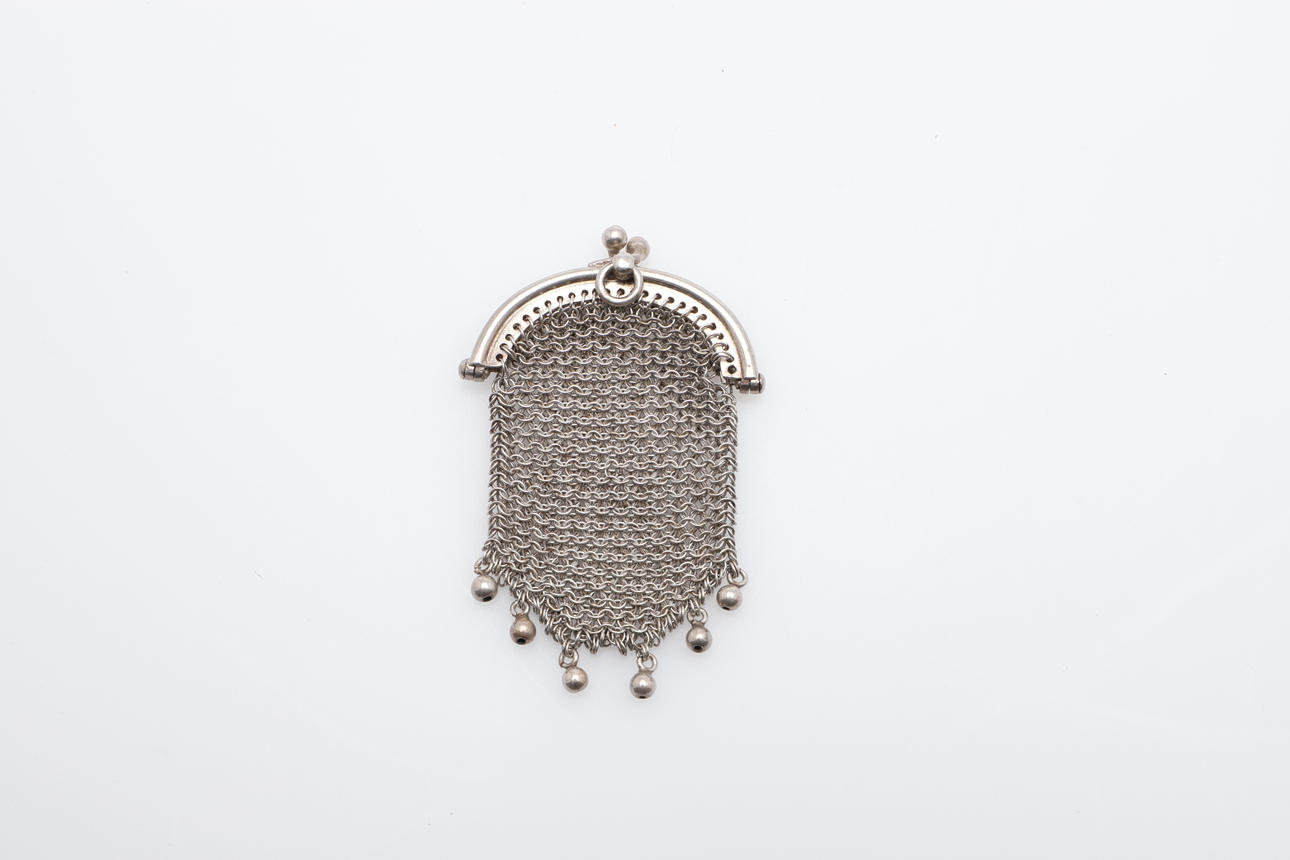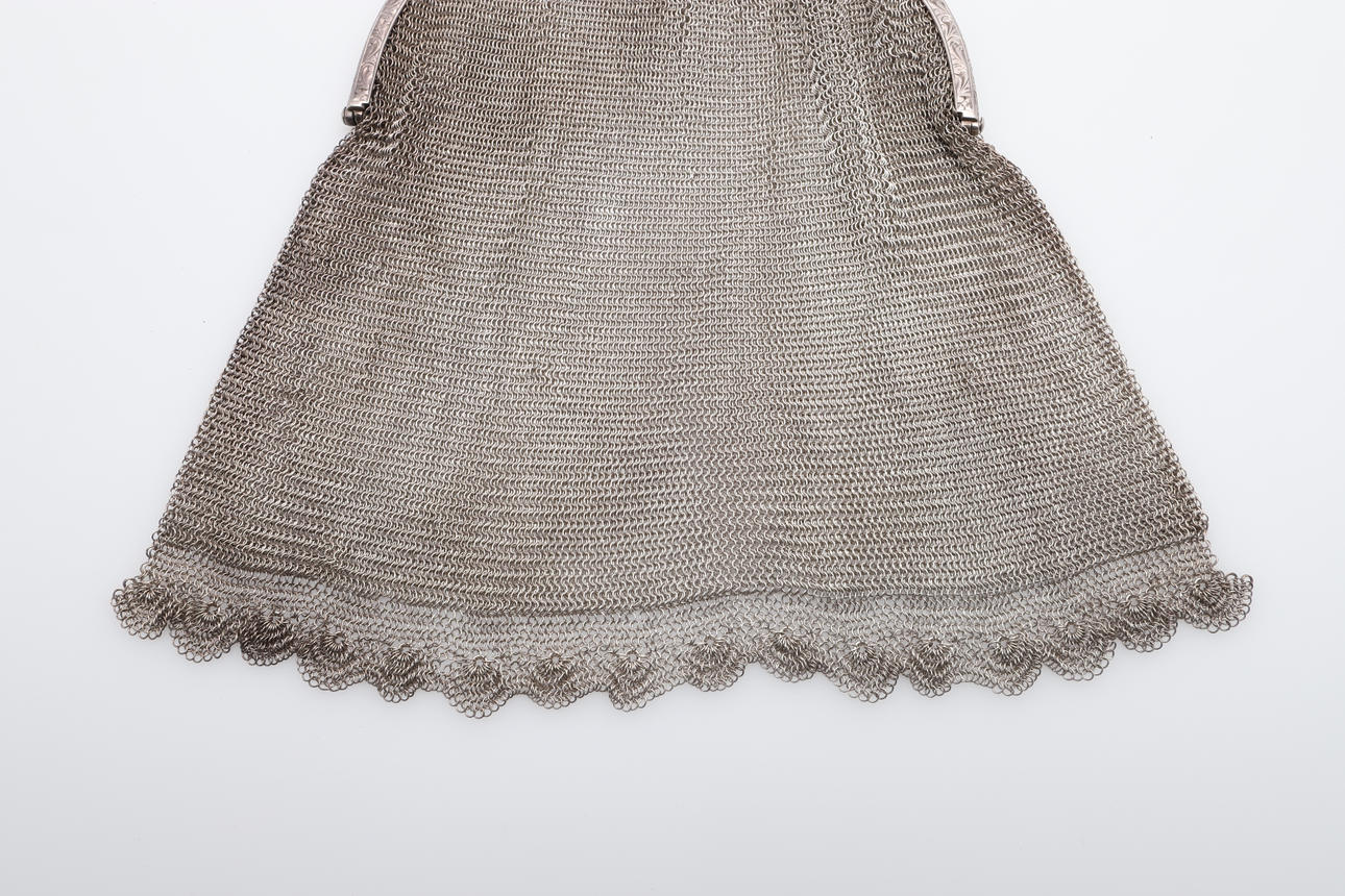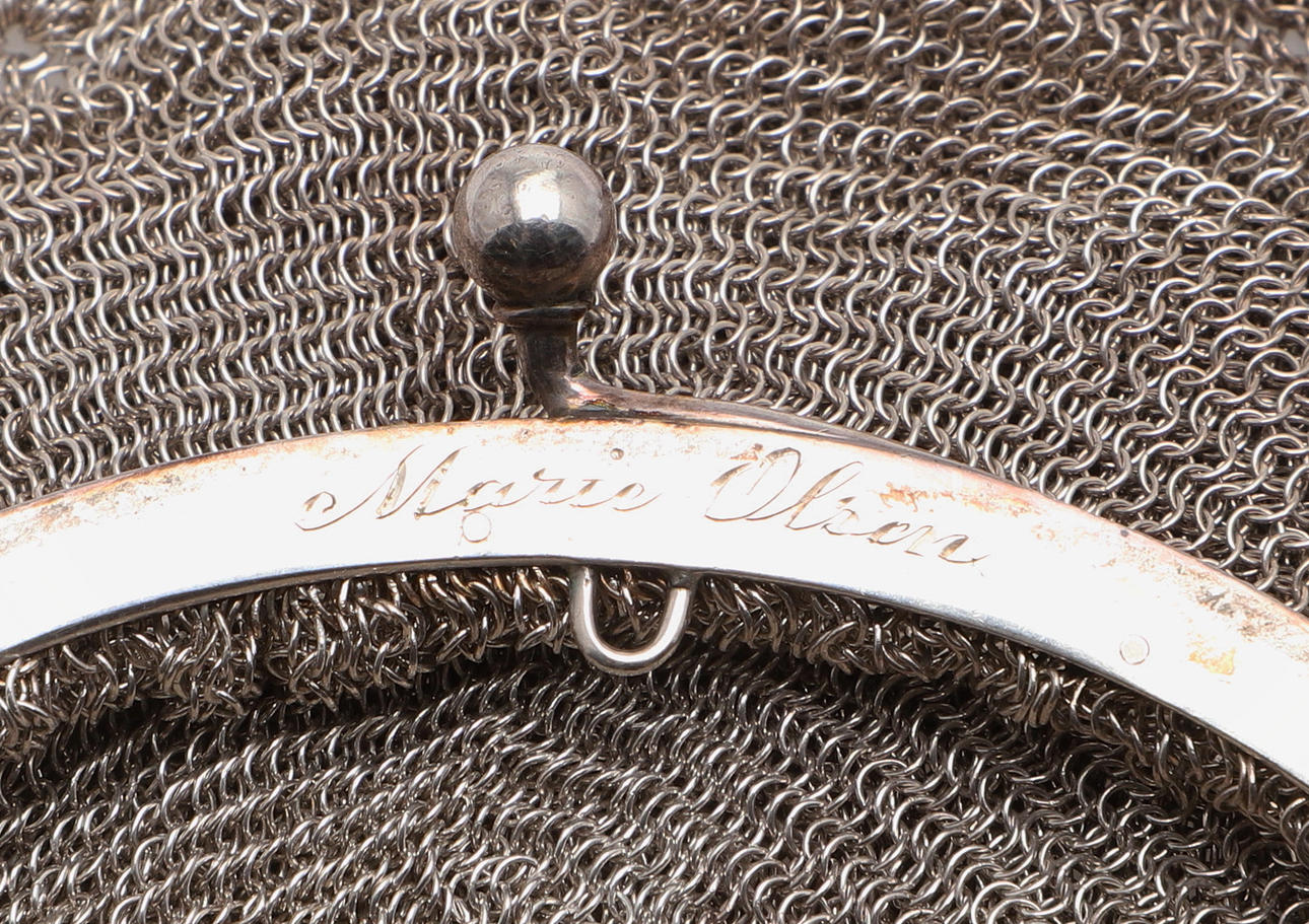 En silverkedja postväska, stämplad 830 standard och inskriven med ett namn på insidan (19cms hög, 6.5ozs), även med två andra mindre kedjepostväskor (omärkt) (3).