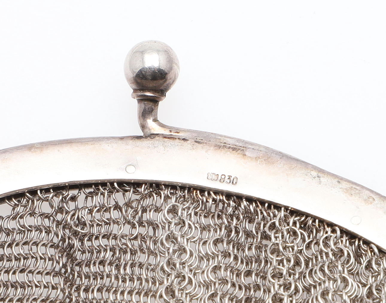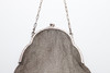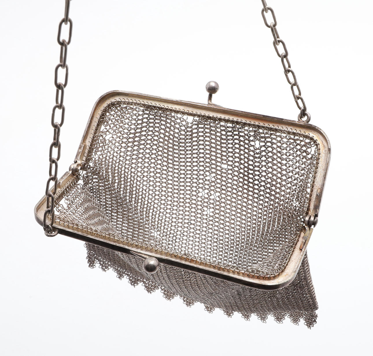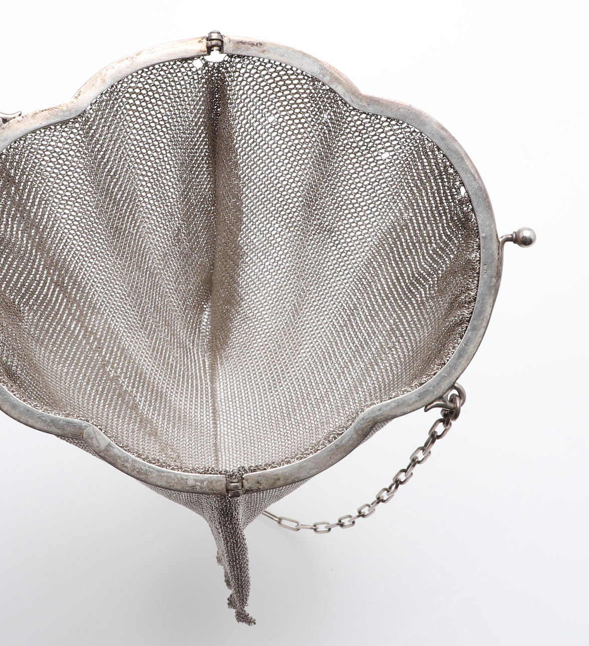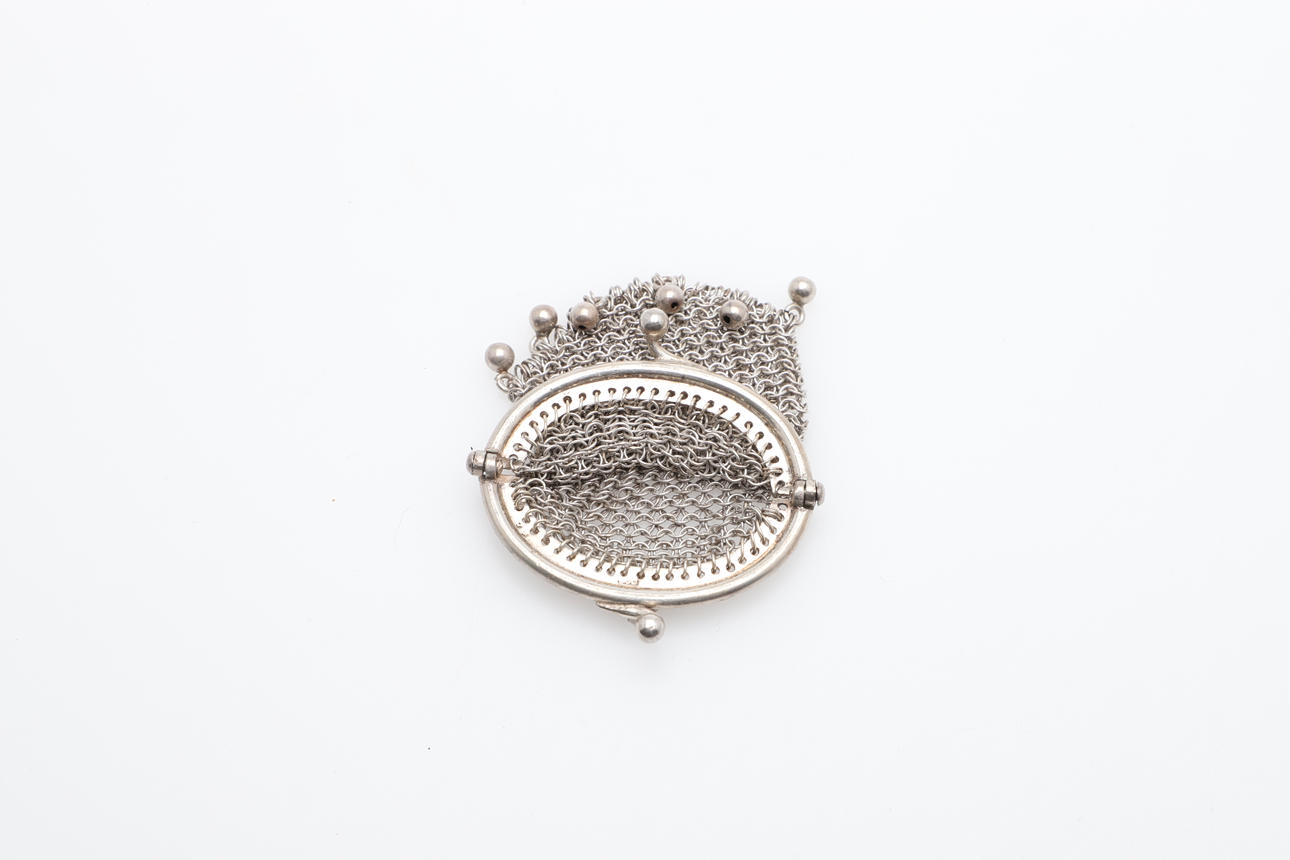 En silverkedja postväska, stämplad 830 standard och inskriven med ett namn på insidan (19cms hög, 6.5ozs), även med två andra mindre kedjepostväskor (omärkt) (3).
