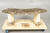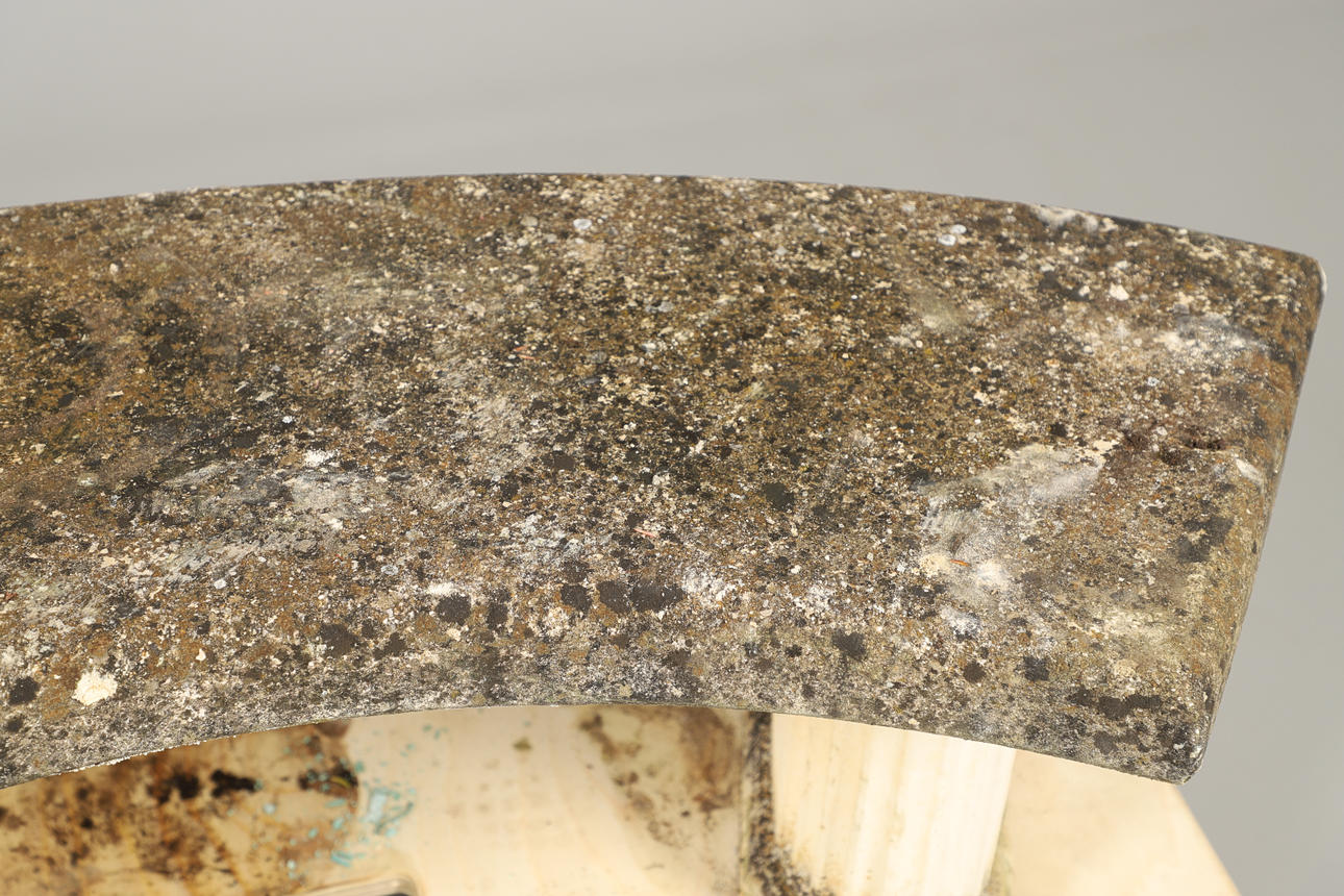 Halvmåne säte stöds av ett par rekonstituerade stenstöd. Höjd 42cm x Längd 126cm x Djup 40cm.