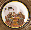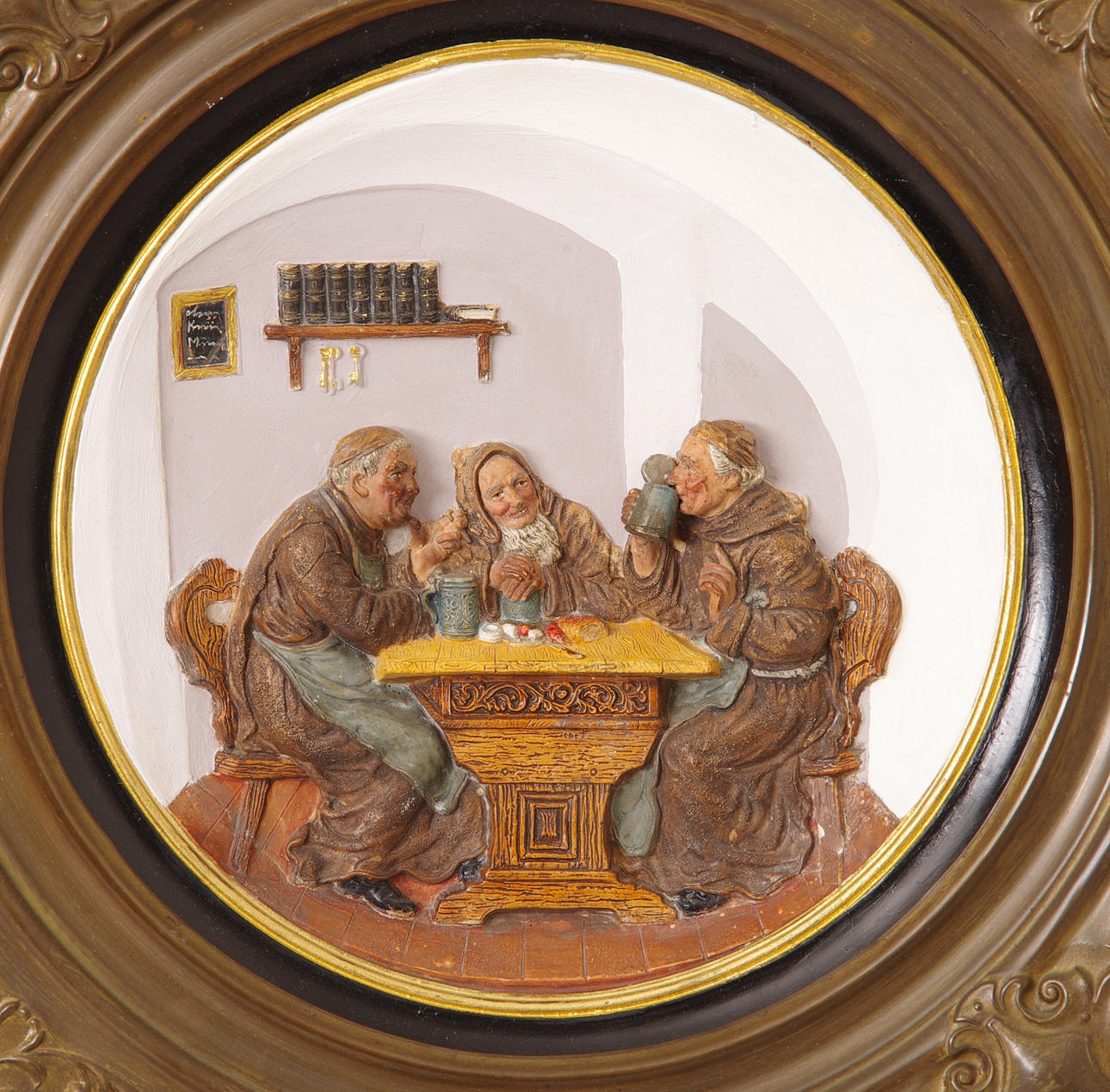 280356. RELIEFTAVLA I MÄSSINGSRAM, drickande munkar.