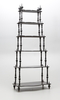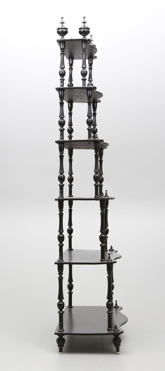 Svärtat lövträ, 6 hyllplan med svarvade stolpar o knoppar.Längd 75, bredd 38, höjd 180 cm.