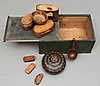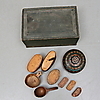 Bl a kåsor och näverarbeten. Ljuslåda: Längd 46 cm.