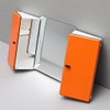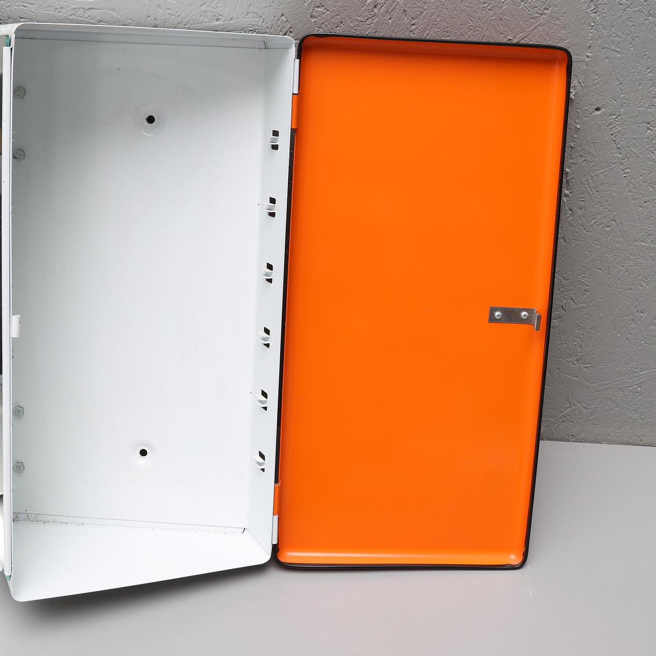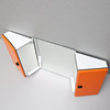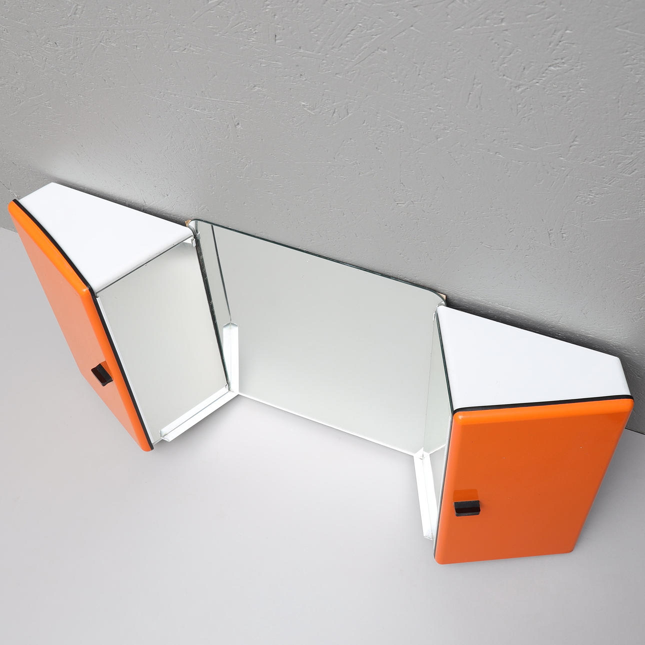 Två dörrar med plats för bakomliggande hyllplan (dessa saknas). Tre-delad spegel.