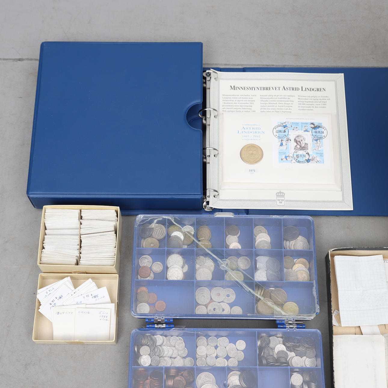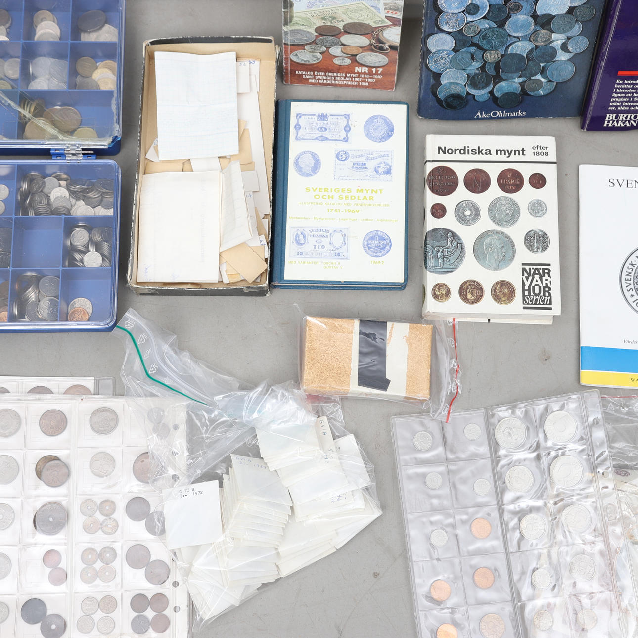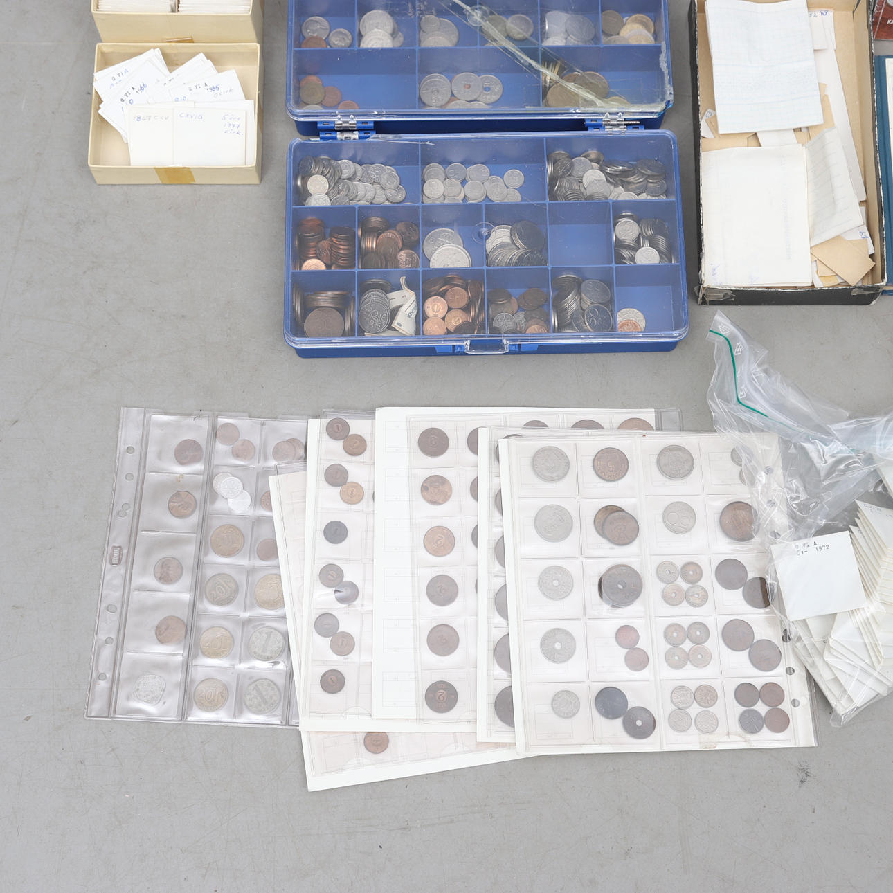 Stort parti mynt i olika valörer, utgivningsår och ursprungsländer.