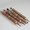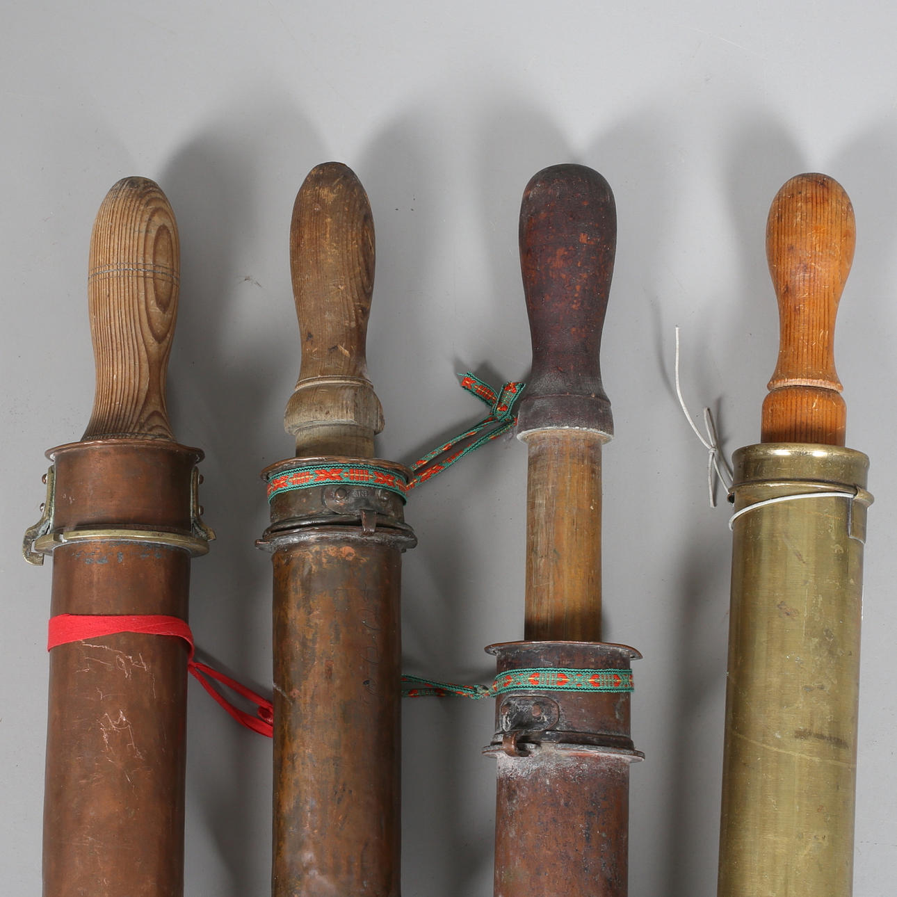 Handtag i trä. 3 st i koppar, 1 st i mässing. Längd (exklusive handtag) 59 - 70 cm.