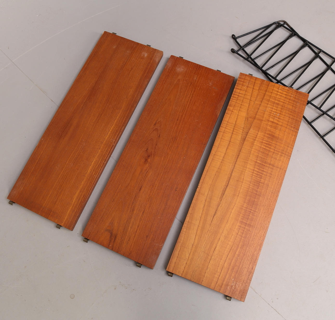 Slitage, ställvis avskavd plastöverdrag, hyllplans med repor och märken.